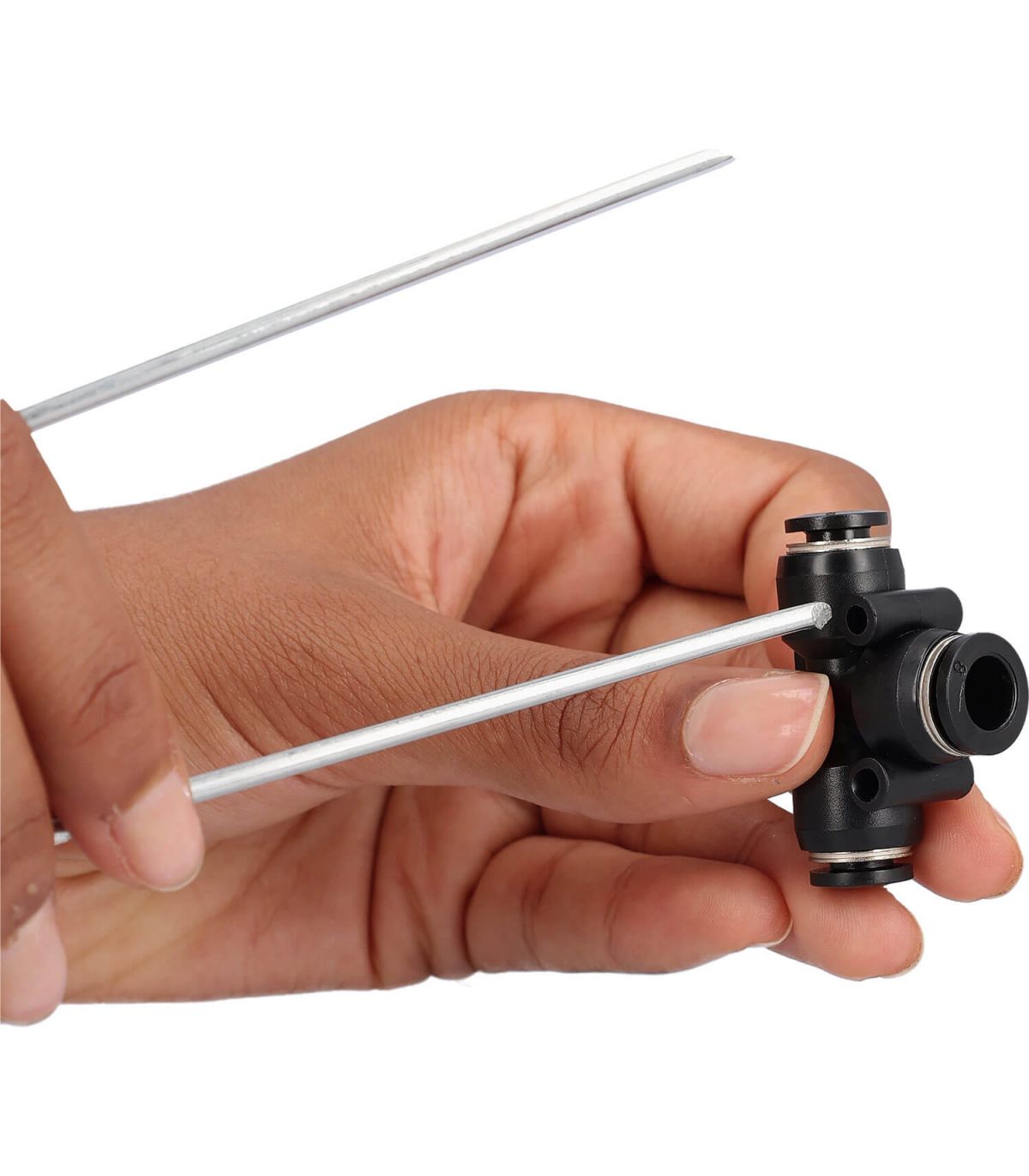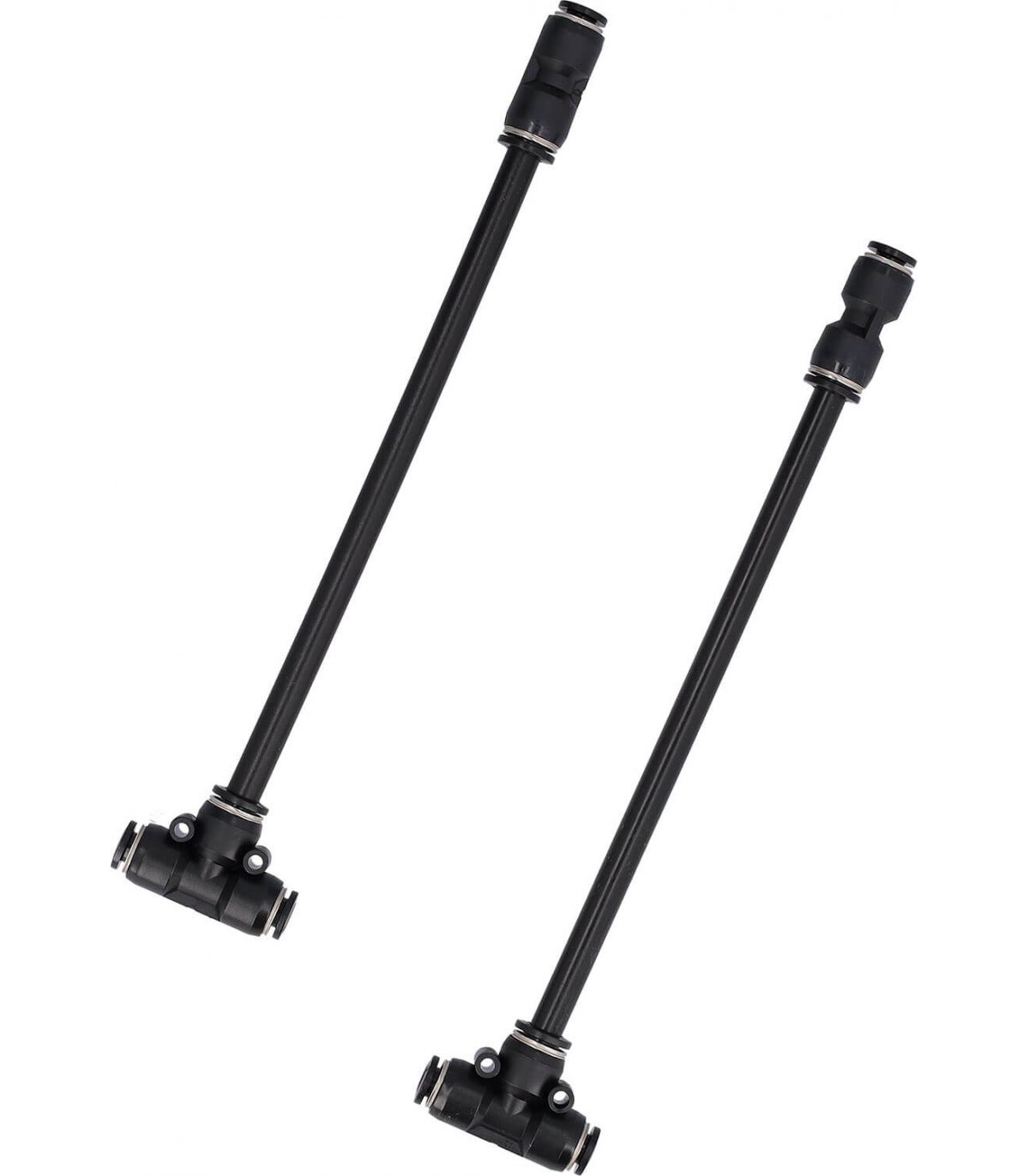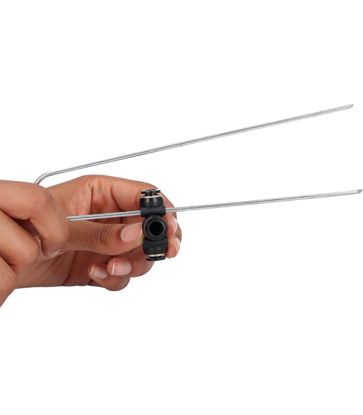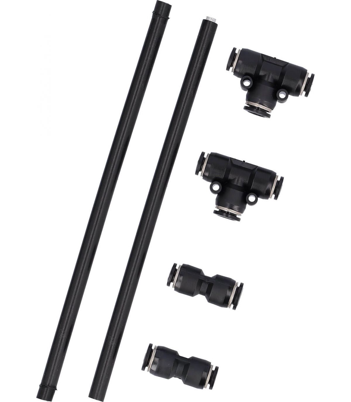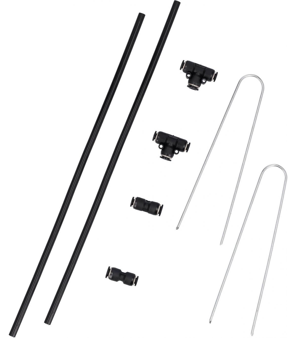 - 2 tubes flexibles 50 cm ø 8 mm, 2 raccords en T ø 6-8-6 mm, 2 raccords droits ø 6-8 mm, 2 piquets porte-tube 20 cm