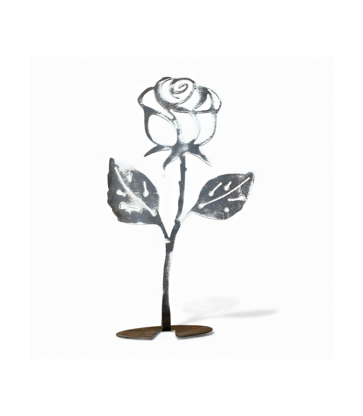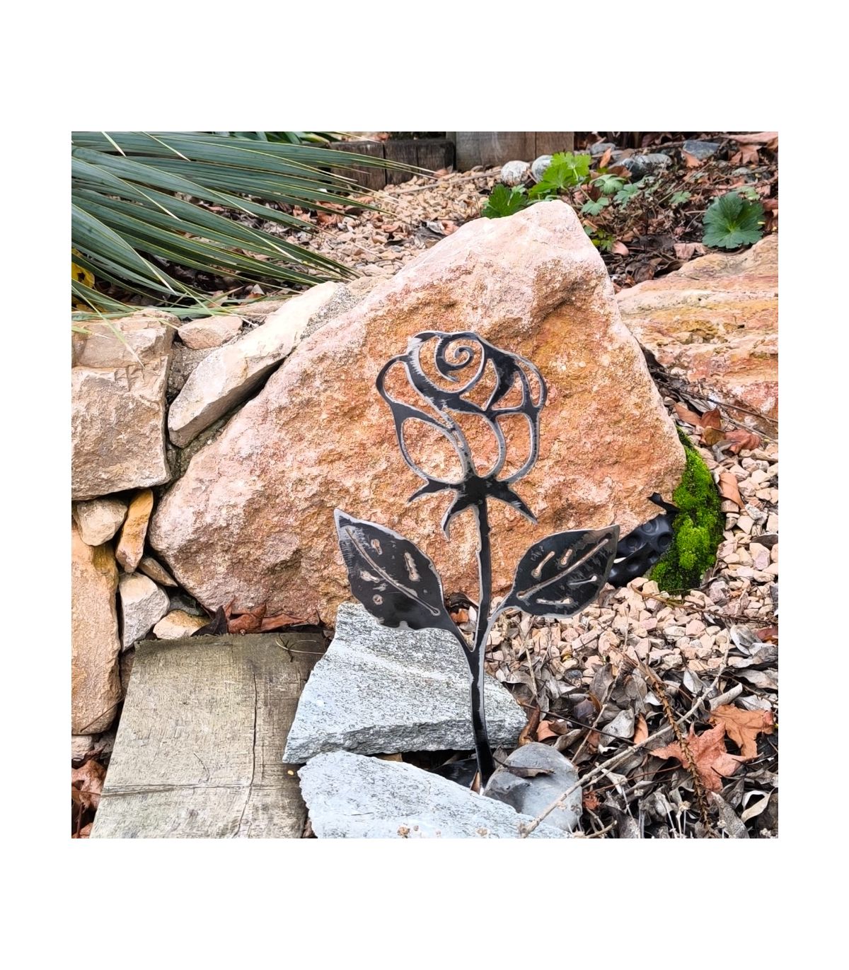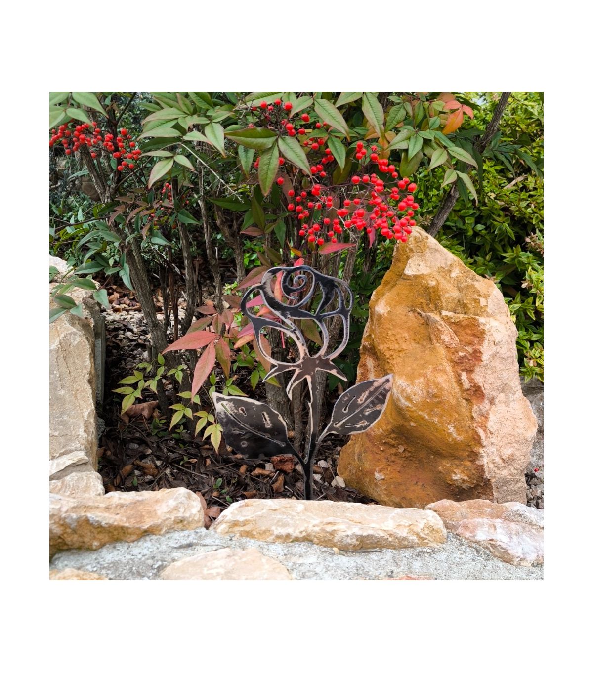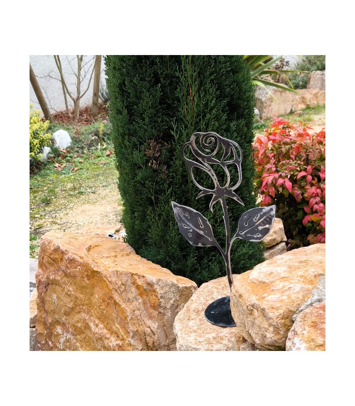 La rose décorative présente une hauteur de 35 cm et une profondeur de 12 cm, offrant un volume visuel harmonieux dans un jardin ou sur un balcon. L’acier plein utilisé pour sa fabrication affiche une épaisseur de 1 mm, garantissant une bonne tenue structurelle tout en conservant une esthétique légère. Le socle fourni stabilise la sculpture métallique, permettant une pose fiable sur terre, graviers ou support rigide.