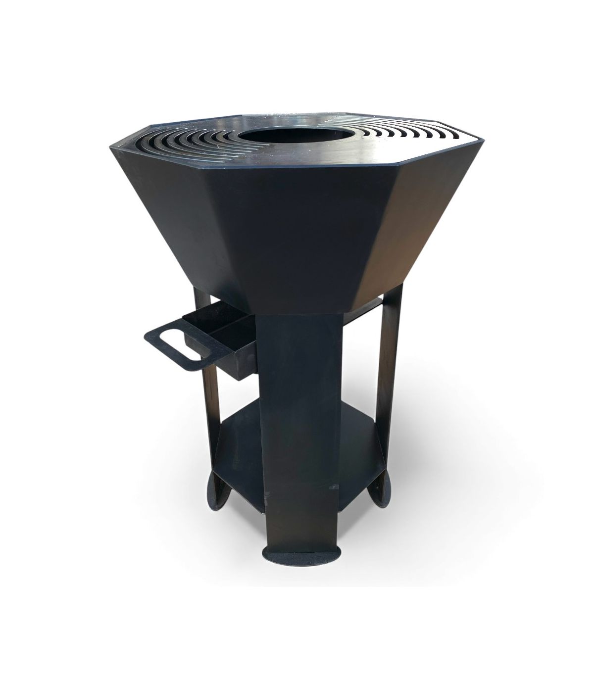 Le braséro AKNOR est conçu en acier épais de 6 mm, garantissant une résistance élevée à la chaleur et une longue durée d’utilisation. Sa cuve octogonale de 56 cm, son poids de 50 kg et ses pieds en acier de 4 mm assurent une stabilité optimale pour les séances de cuisson ou de chauffage.