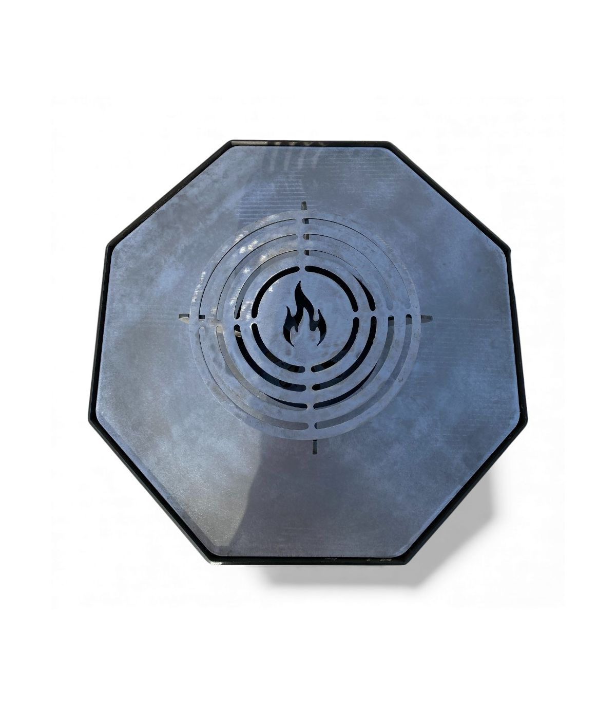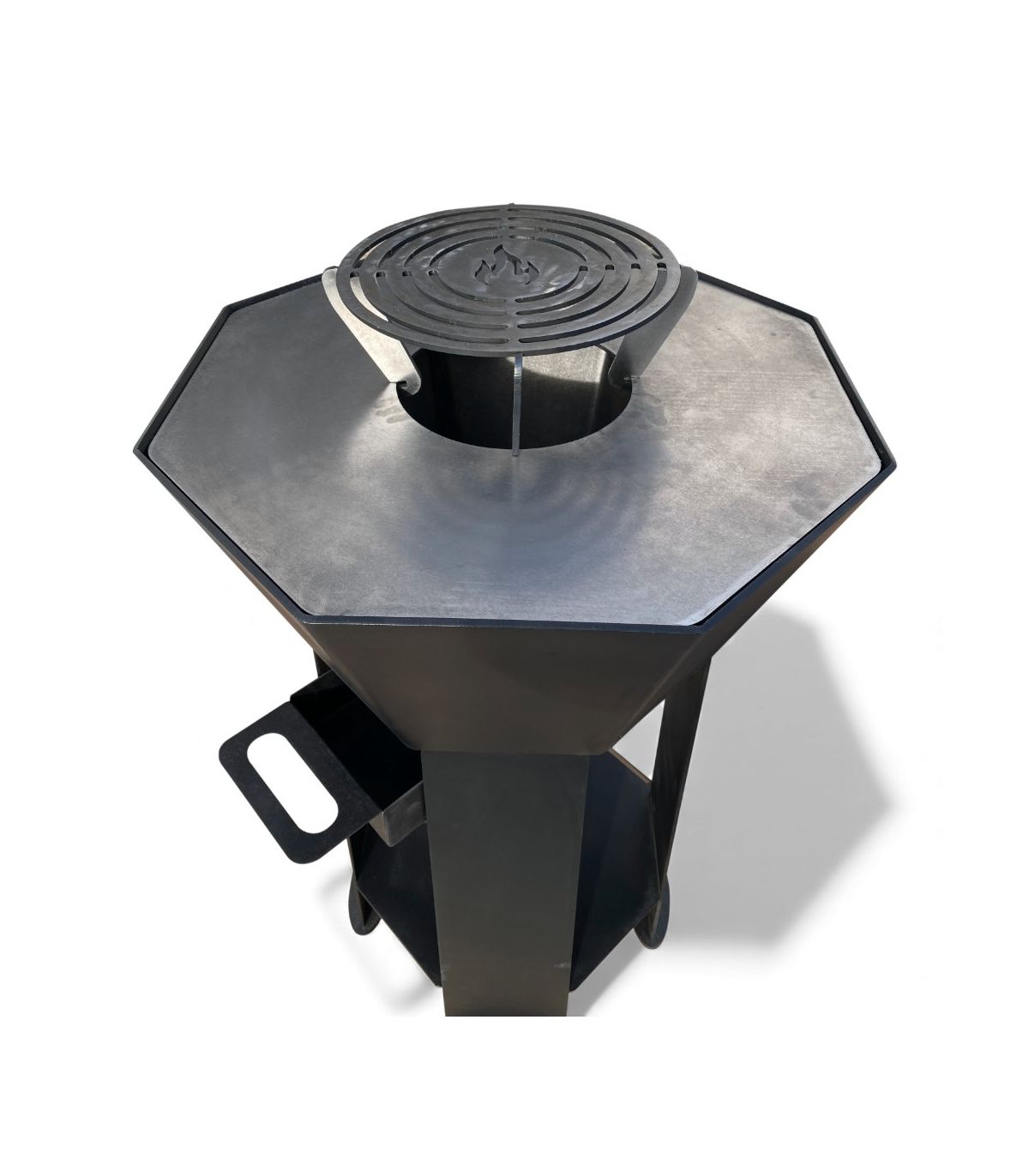 La plaque plancha fournie dans le pack est conçue en acier de 5 mm, garantissant une diffusion régulière de la chaleur. Sa forme octogonale 56 cm crée une large surface de cuisson, adaptée aux viandes, poissons, légumes ou accompagnements préparés autour du foyer.