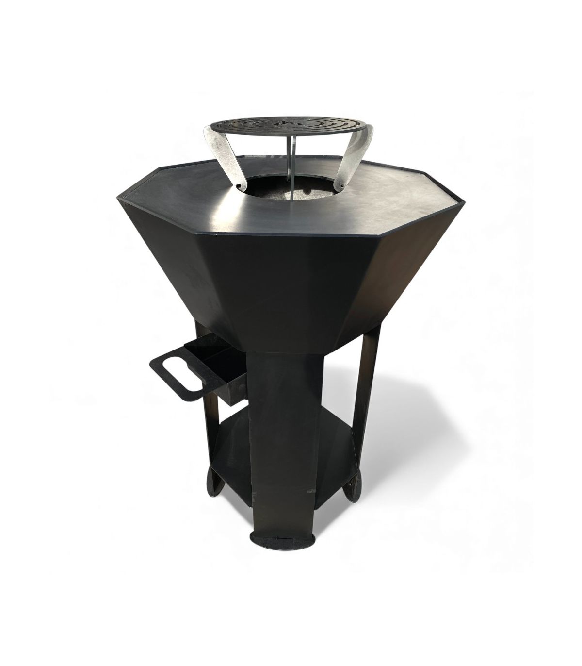 Le braséro AKNOR est fabriqué en acier épais de 6 mm, adapté aux fortes températures et aux usages réguliers. Sa cuve octogonale de 56 cm, ses pieds renforcés en acier 4 mm et son poids de 50 kg assurent une stabilité optimale pendant la cuisson ou le chauffage. La capacité de 36 L permet d’alimenter un foyer puissant et homogène.