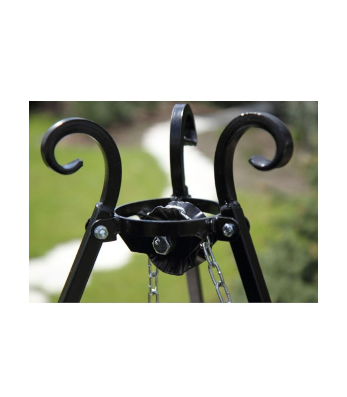 Combiné avec un mécanisme d'ouverture à l'aide d'une manivelle le trépied crée un ensemble barbecue parfait. Le trépied est revêtu de poudre, ce qui crée une protection résistante aux intempéries, rayons UV et la pluie.