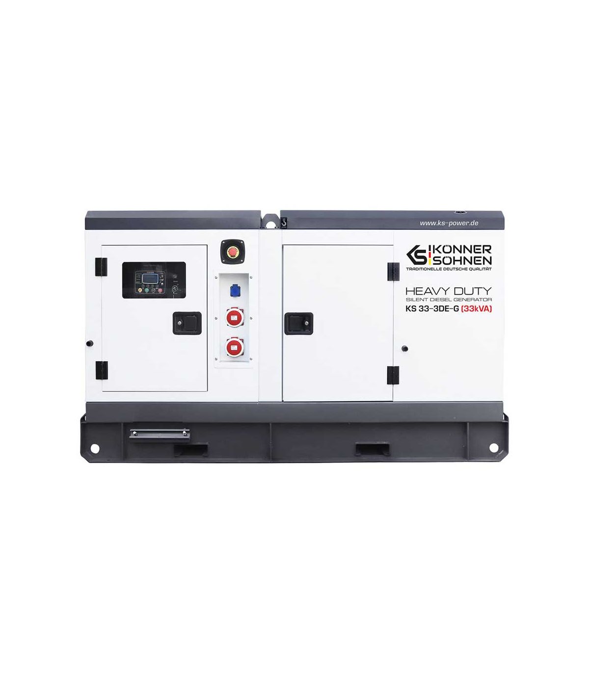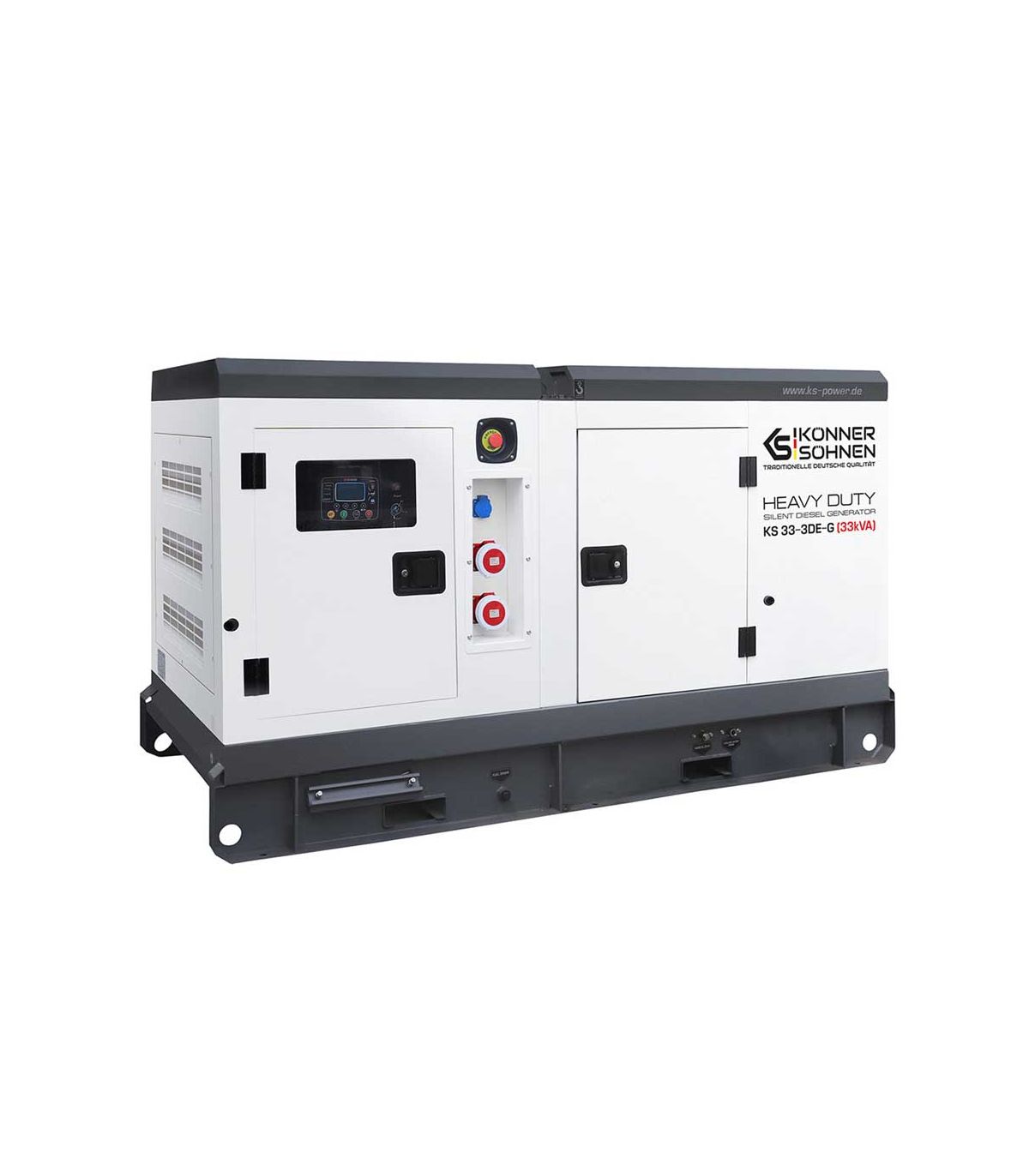 Le KS 33-3DE-G est conçu pour offrir une grande durabilité et une utilisation pratique dans des conditions difficiles. Le boîtier est insonorisé, ce qui réduit le bruit au minimum (seulement 72 dB(A) à 7 mètres), tout en étant résistant aux intempéries, à la corrosion et au vandalisme grâce à son revêtement galvanisé. Cette construction robuste permet au générateur de résister aux conditions climatiques les plus sévères, tout en offrant un fonctionnement silencieux grâce à l'utilisation de patins anti-vibrations.