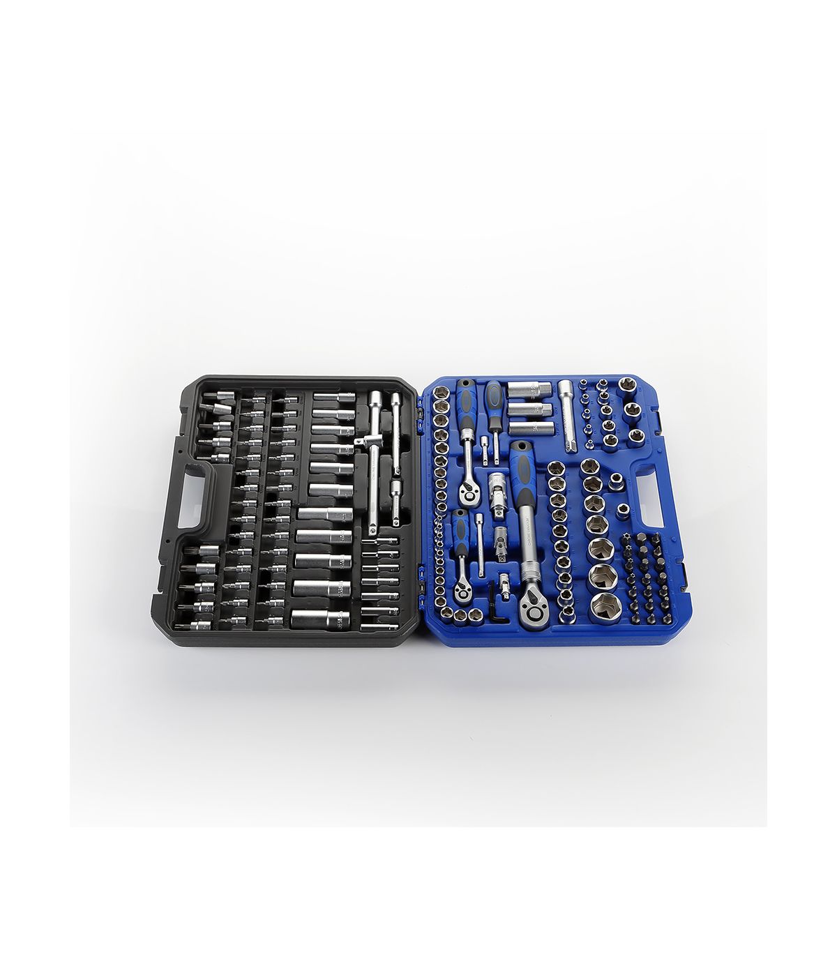 Set de clés à douilles ½", 3/8" et ¼" 155 pièces en acier chrome vanadium, durabilité et résistance à l'usure maximales.Les outils sont chromés pour leur donner la meilleure protection possible contre la rouille. Cela augmente considérablement la durée de vie des pièces et garantit une capacité de serrage supérieure aux normes DIN sur une longue durée de vie.Les clés à cliquet ont un mécanisme de serrage très précis, elles sont inclinées pour un confort de serrage et ont une très longue durée de vie.Contient un étui en plastique permettant de bien ranger tous les outils et d'accéder le plus rapidement possible à l'outil souhaité. Coffret parfait pour les entreprises de montage, de maintenance, de service technique, etc.Cet ensemble de douilles est idéal pour tout travail de mécanique ou de bricolage en raison de la variété et de la quantité d'accessoires qu'il contient. Parfait pour les travaux mécaniques, automobiles, d’assemblage et pour le bricolage domestique. Les douilles de diverses dimensions sont parfaites pour le serrage dans l'automobile, le bricolage, et l'industrie lourde et légère.