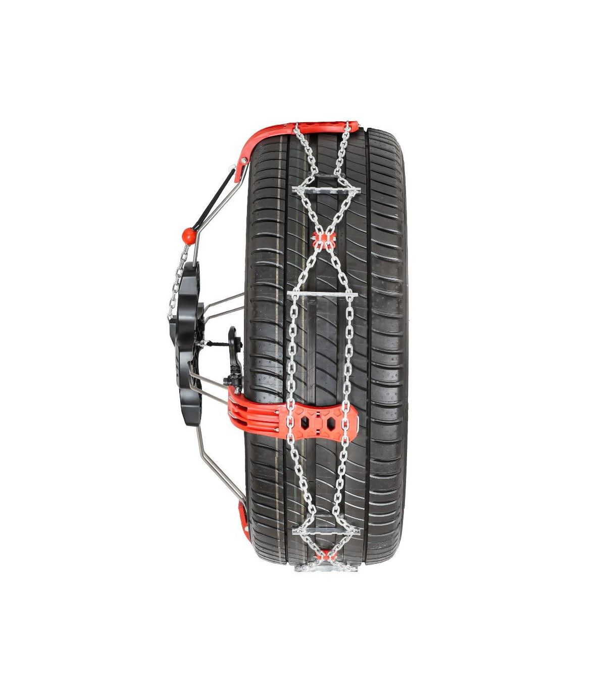 La structure en X assure une répartition homogène de la traction sur la surface du pneu, améliorant ainsi l’adhérence et la motricité, que ce soit sur la neige tassée ou sur la glace. Les patins en polyuréthane souples mais résistants protègent les jantes et réduisent les vibrations, tandis que les maillons en acier renforcé de 9 mm assurent une robustesse exceptionnelle et une longévité accrue face à l’usure et aux contraintes de la route.