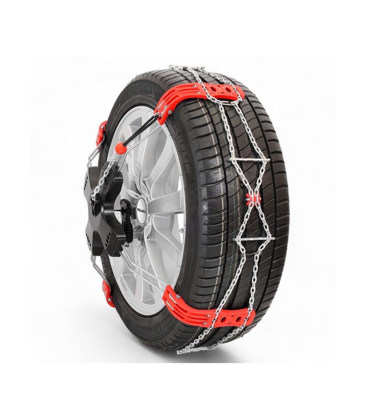 La structure en X assure une répartition homogène de la traction sur la surface du pneu, améliorant ainsi l’adhérence et la motricité, que ce soit sur la neige tassée ou sur la glace. Les patins en polyuréthane souples mais résistants protègent les jantes et réduisent les vibrations, tandis que les maillons en acier renforcé de 9 mm assurent une robustesse exceptionnelle et une longévité accrue face à l’usure et aux contraintes de la route.