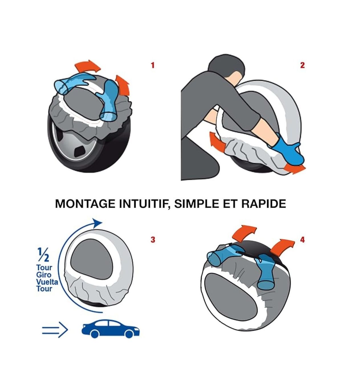 • Montage rapide et instinctif en moins de 10 minutes sur les pneus de votre voiture.