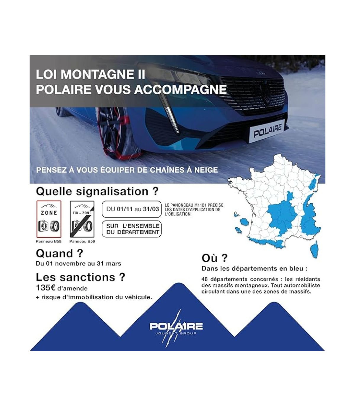 Conformes à la réglementation B26 (article R60 du Code de la Route), ces chaussettes sont autorisées sur l’ensemble du réseau routier soumis à la “loi Montagne”. Leur compatibilité étendue couvre la majorité des véhicules de tourisme, SUV, monospaces, camping-cars et utilitaires, à l’exception des modèles déclarés non chaînables.
