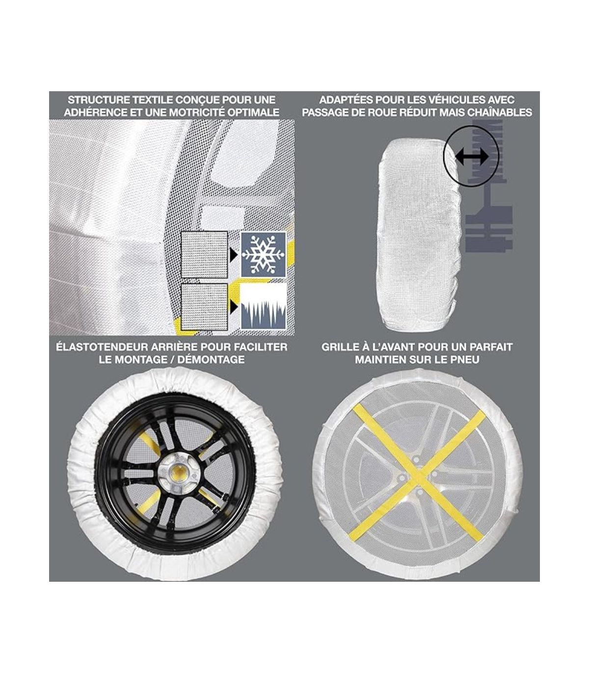 Les chaussettes neige haute résistance Eco assurent une adhérence optimale sur routes enneigées ou verglacées, tout en garantissant un confort de conduite supérieur. Leur conception textile innovante permet un montage rapide et intuitif, réalisable en moins de 10 minutes, sans outil ni manipulation complexe.