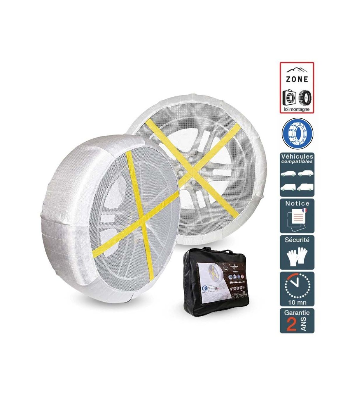Les chaussettes neige haute résistance Eco assurent une adhérence optimale sur routes enneigées ou verglacées, tout en garantissant un confort de conduite supérieur. Leur conception textile innovante permet un montage rapide et intuitif, réalisable en moins de 10 minutes, sans outil ni manipulation complexe.