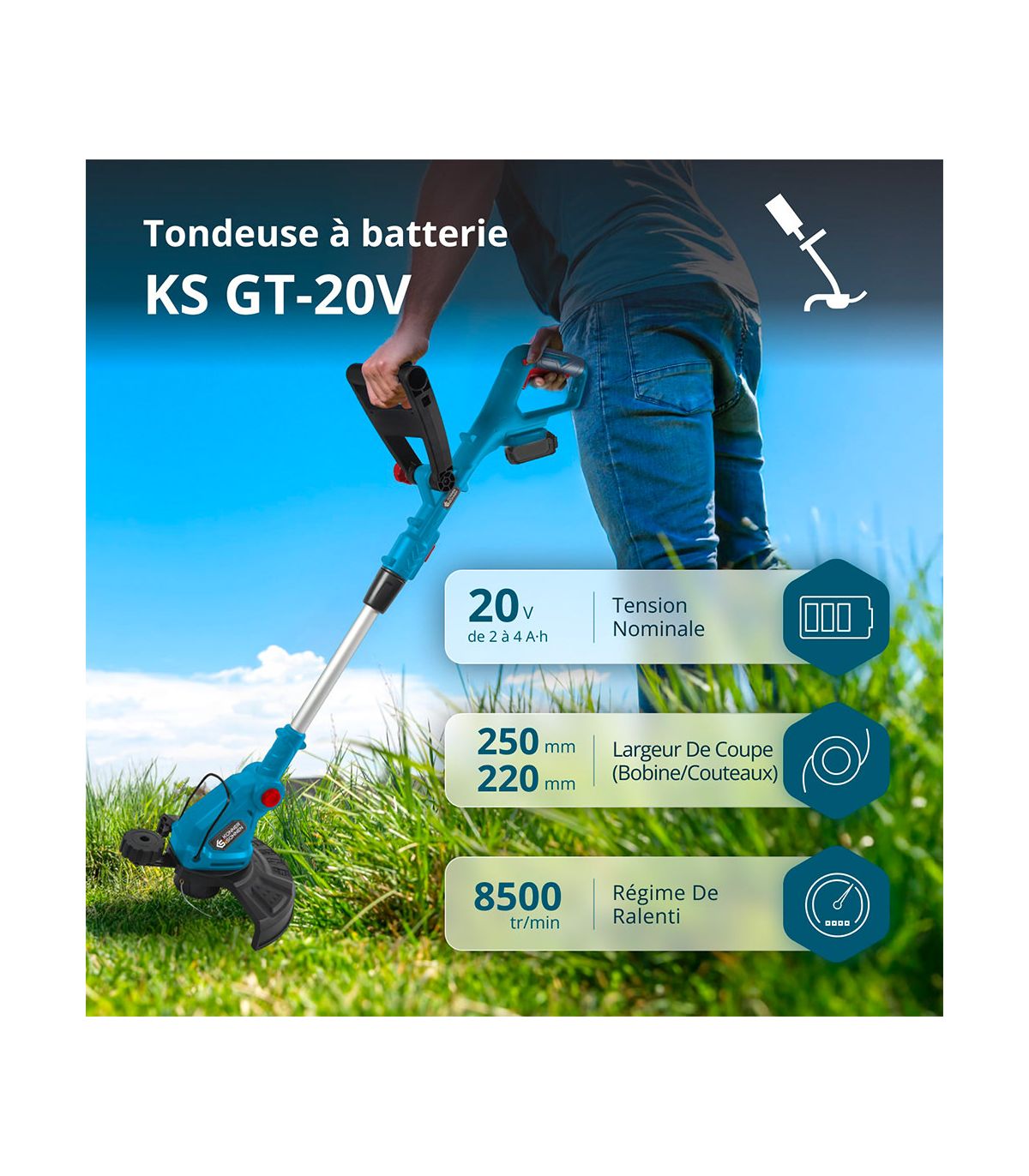 Fini le câble électrique que l'on traîne et que l'on risque de sectionner, fini les mélanges d'essence salissants. Le KS GT-20V fait partie de la plateforme 20V de la marque. Vous pouvez utiliser n'importe quelle batterie 20V K&S (2Ah, 4Ah, etc.). Cette technologie lithium garantit une puissance de coupe constante jusqu'à la dernière minute d'autonomie. C'est l'énergie propre et silencieuse par excellence.