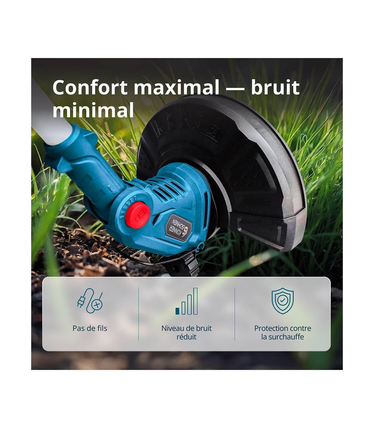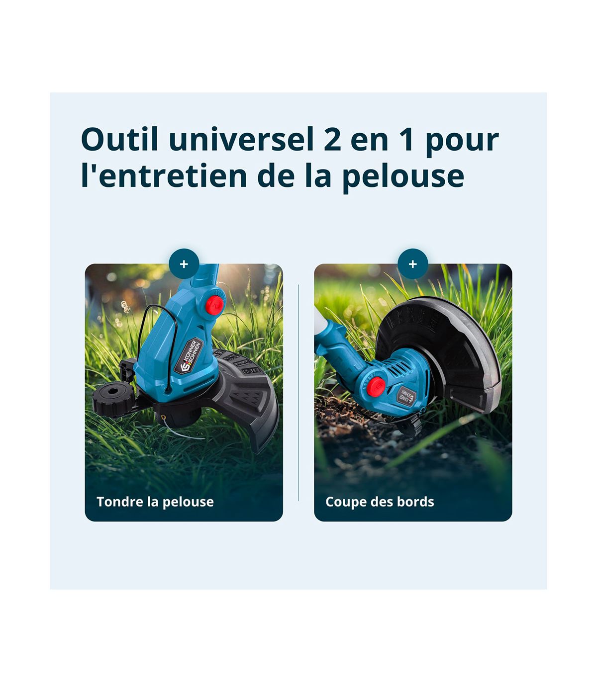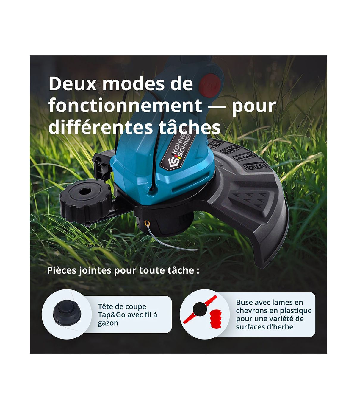 Le coupe-bordures à batterie KS GT-20V de Könner & Söhnen est l'évolution logique de l'outil de jardinage moderne. Si vous avez un jardin varié, avec à la fois de la pelouse soignée et des zones plus sauvages où poussent des herbes dures et des mauvaises herbes coriaces, le KS GT-20V est l'outil qu'il vous faut. Il brise les codes en proposant un système de coupe hybride qui s'adapte à chaque défi de votre jardin.