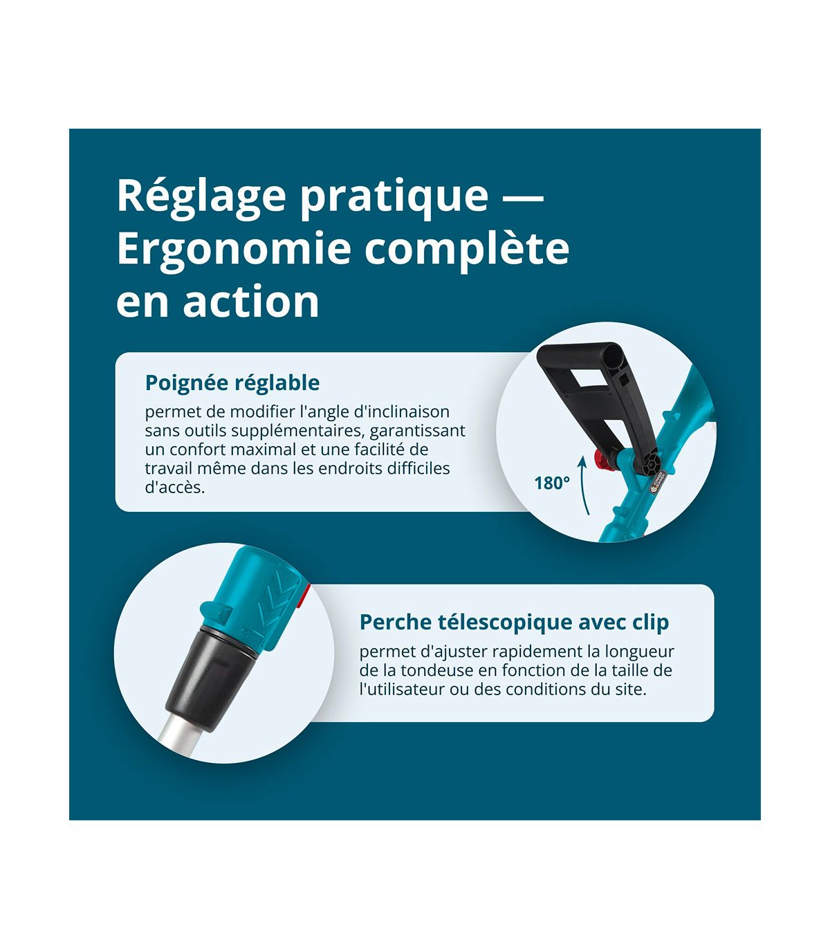 - Ergonomie Totale : Manche télescopique et poignées ajustables pour un confort de travail personnalisé.