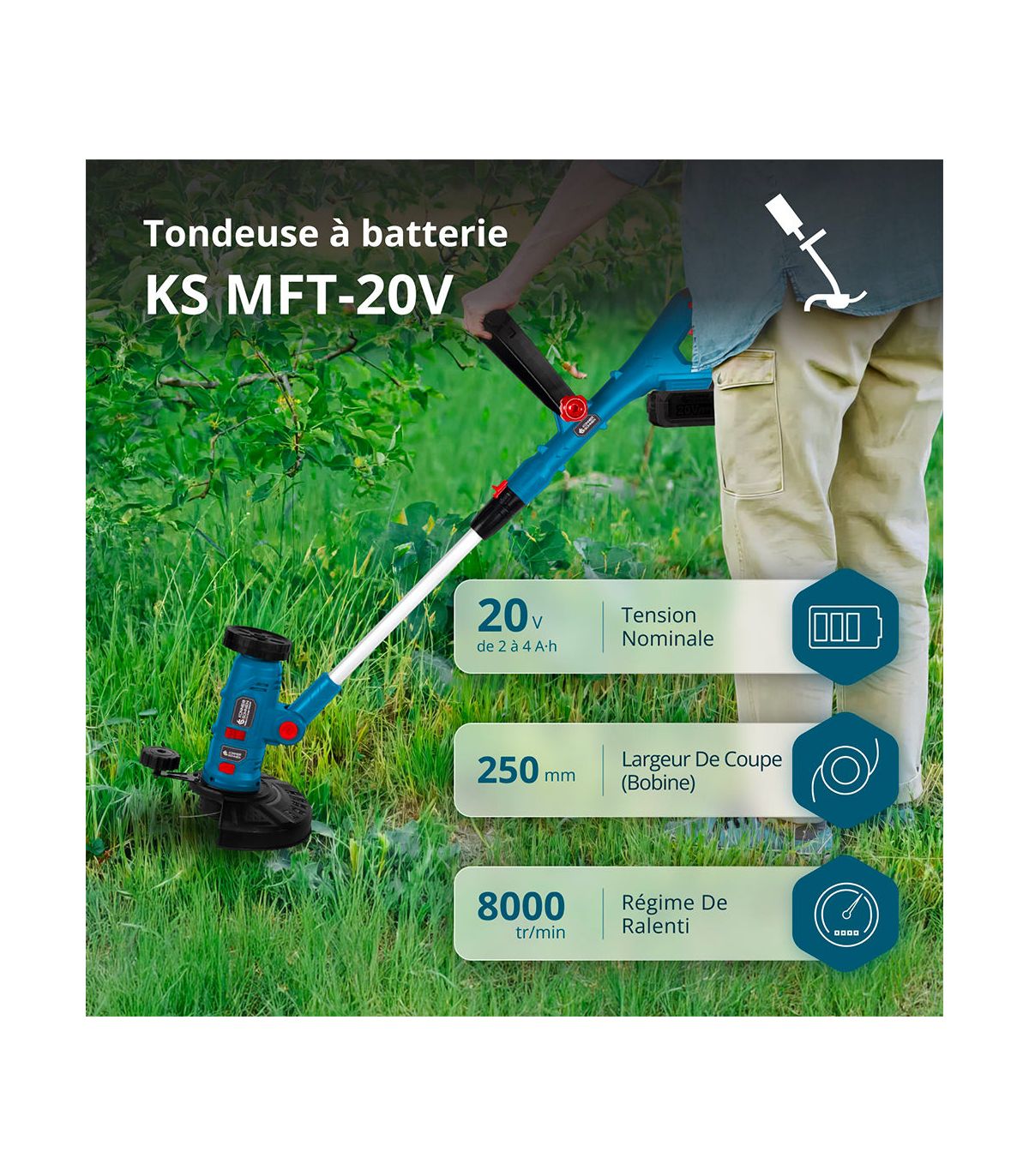 Pour que chacune de ces fonctions soit efficace, le KS MFT-20V propose des réglages uniques. Le bloc moteur est ajustable sur 6 positions d'angle. Cela permet par exemple de mettre le moteur à plat pour balayer, ou de l'incliner pour passer sous un banc public. Le manche télescopique permet d'ajuster la hauteur de l'outil pour que vous soyez toujours dans une posture ergonomique, que vous soyez en train de nettoyer le sol ou de tailler une bordure.