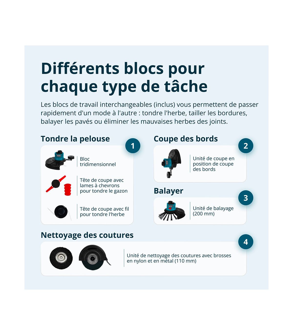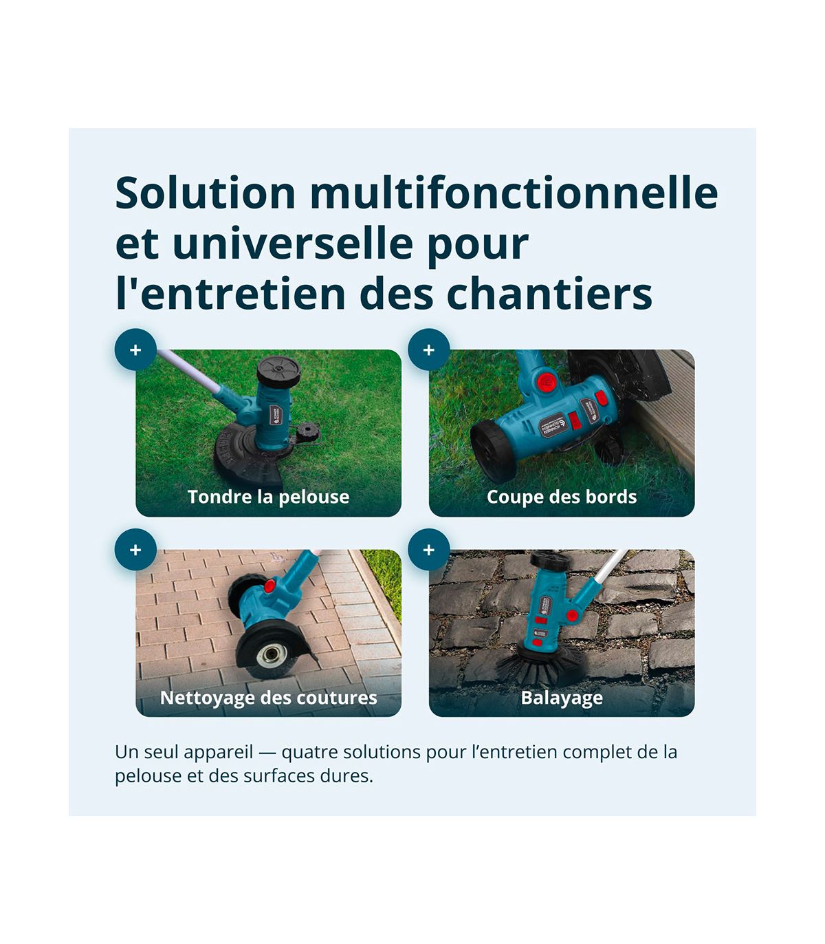 - Têtes Interchangeables : Livré avec tête de coupe gazon, brosse rotative pour joints et brosse de balayage.
