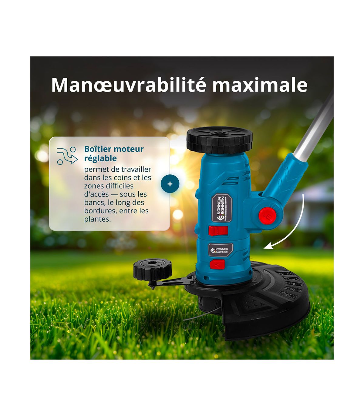 En choisissant le système 20V de Könner & Söhnen, vous optez pour la tranquillité. Plus de bruit de moteur thermique, plus de fumées d'échappement. Le moteur électrique de haute qualité délivre la puissance nécessaire pour chaque tête accessoire avec une régularité exemplaire. Vous pouvez utiliser vos batteries 20V K&S existantes, ce qui rend cet outil extrêmement économique à l'achat pour les utilisateurs déjà équipés.