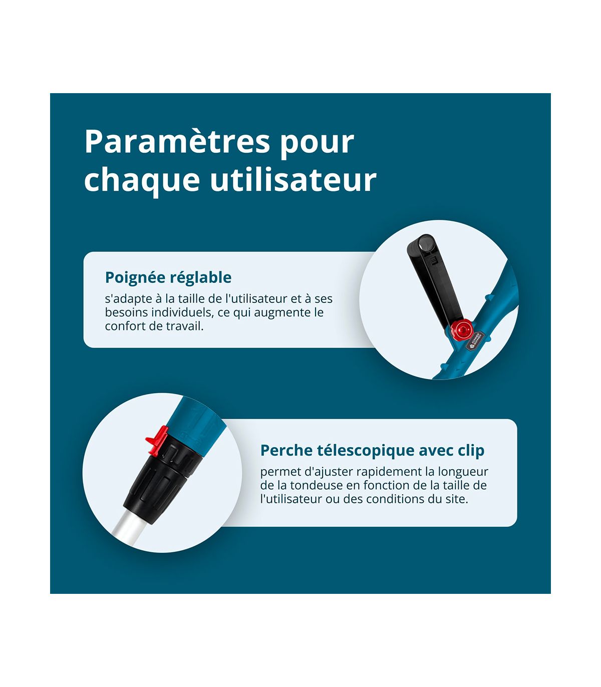 - Système 4-en-1 Multifonction : Un seul moteur pour tondre, faire les bordures, balayer et nettoyer les joints de terrasse.