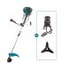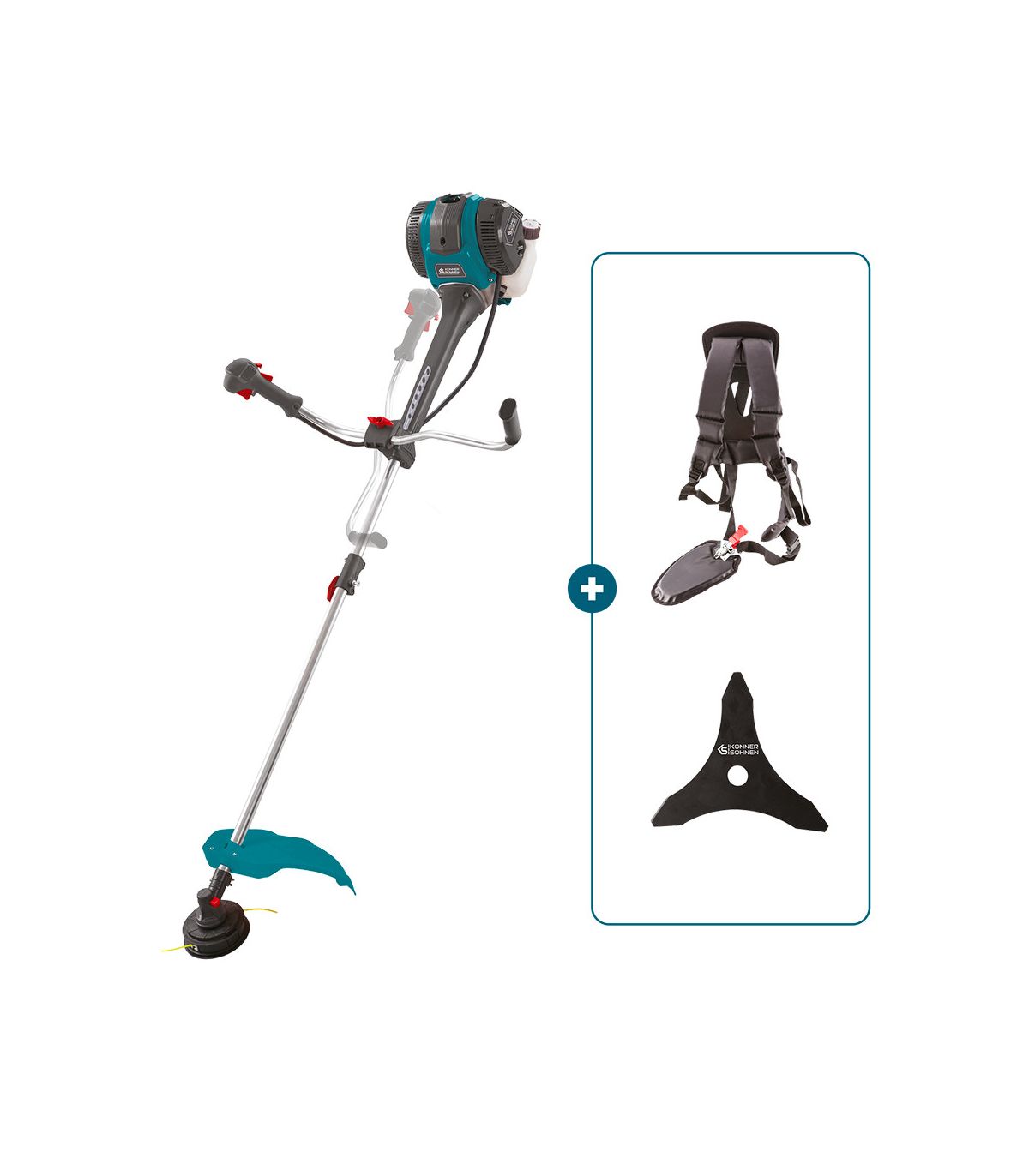 Elle est livrée avec un **harnais dorsal rembourré** très confortable qui supporte le poids de la machine (environ 8-9 kg) sur les épaules, ainsi qu'une tête **Tap&Go** (fil) et une lame en acier forgé 3 dents pour les ronces et broussailles.