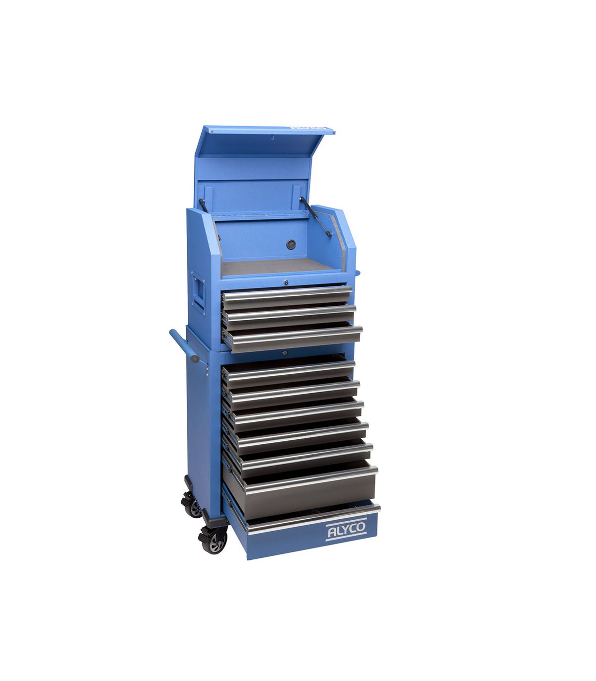 La supériorité technique de la référence 129705 repose sur sa construction en tôle d'acier de forte épaisseur, assemblée pour garantir une rigidité structurelle parfaite. Les 4 tiroirs sont montés sur des glissières télescopiques à roulements à billes de haute qualité. Ce système assure une ouverture sans effort et une durabilité exceptionnelle, capable de supporter le poids de jeux de douilles complets ou de pinces massives sans que les glissières ne se bloquent. Le placard latéral avec porte offre un espace complémentaire idéal pour stocker des bouteilles de fluides, des outils électroportatifs ou des boîtes de vissage encombrantes, rendant ce meuble véritablement polyvalent.