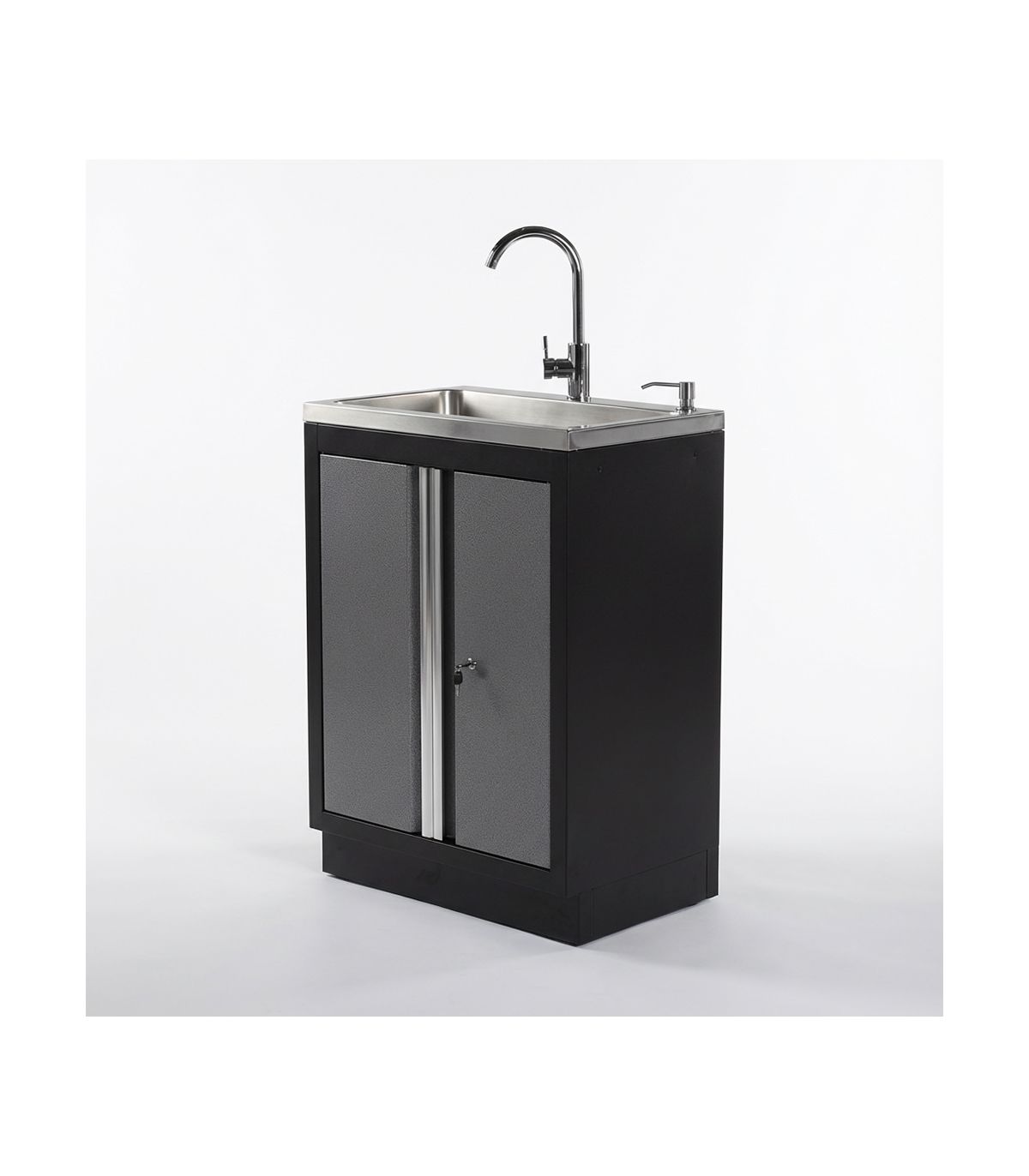 La supériorité technique de la référence 192855 repose sur son plateau supérieur et sa cuve en acier inoxydable de haute qualité. L'inox est le seul matériau capable de résister durablement au contact répété des hydrocarbures, des solvants de nettoyage et de l'humidité sans subir de corrosion. La robinetterie fournie est conçue pour un usage intensif en atelier. Le module inférieur, protégé par une porte robuste, permet d'accéder facilement aux raccordements hydrauliques tout en offrant un espace de stockage pour les produits de nettoyage ou les bacs de récupération.