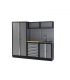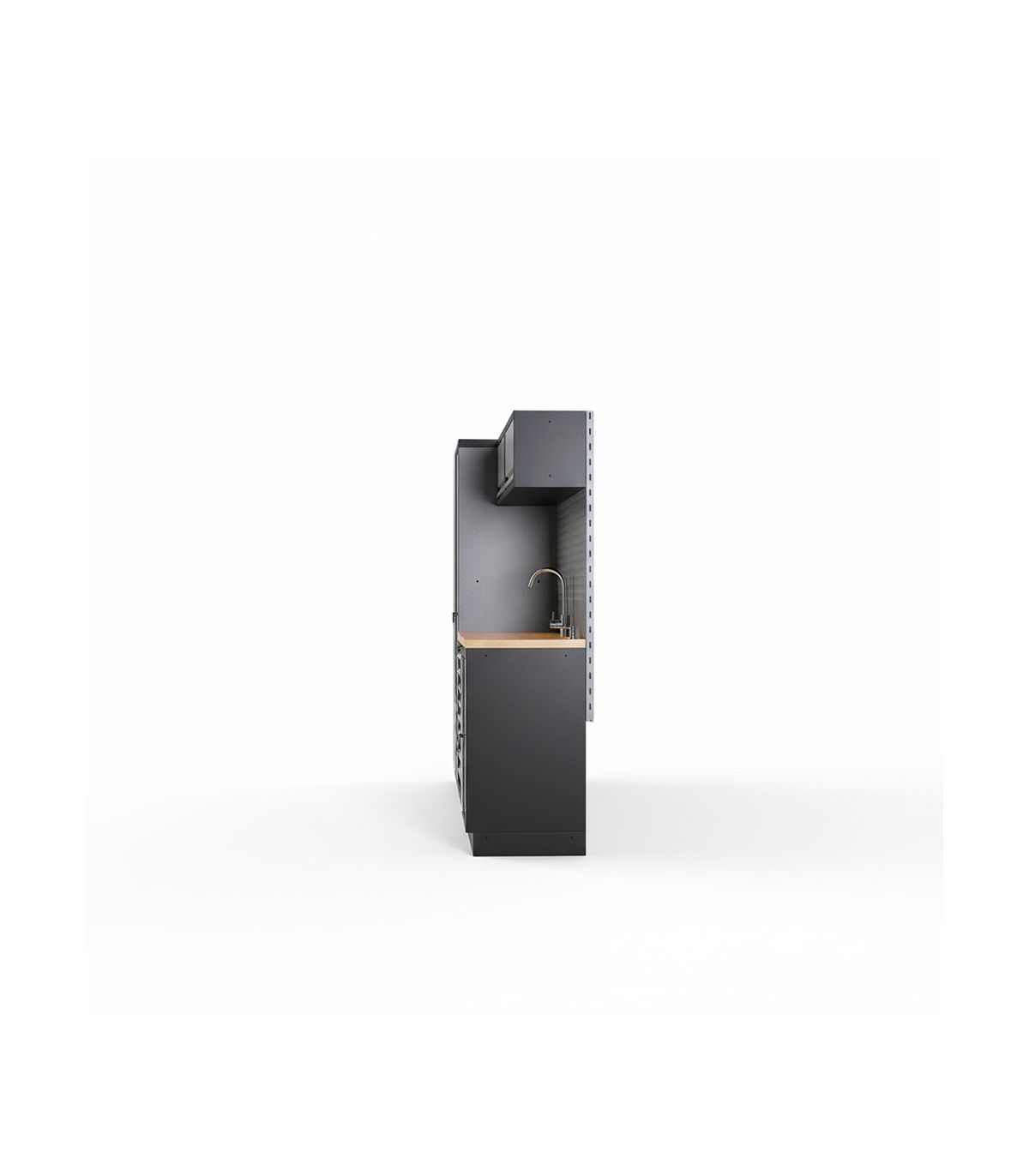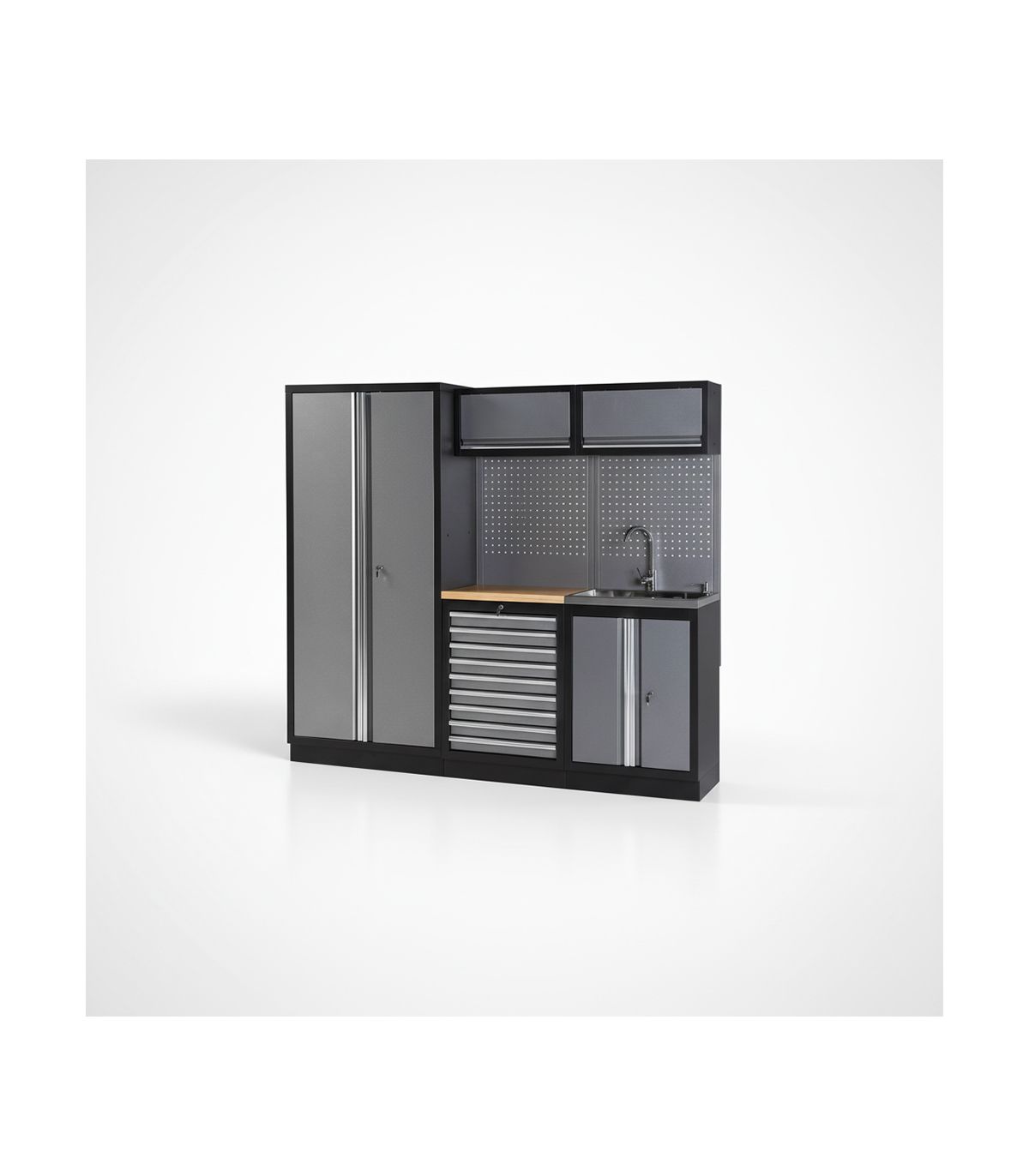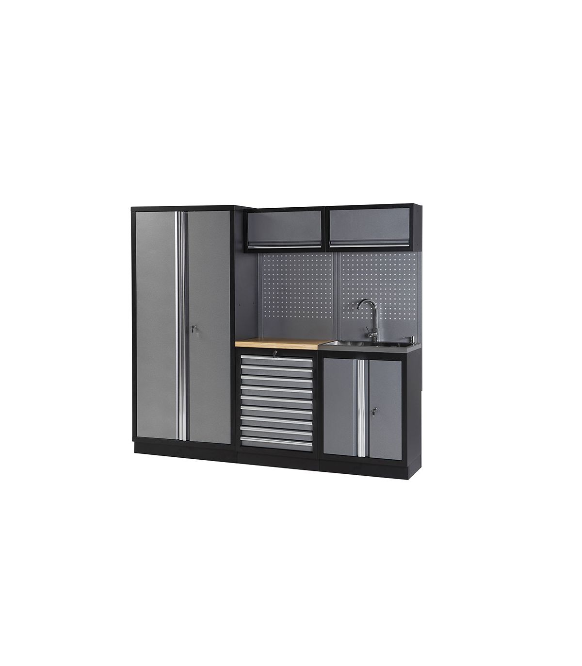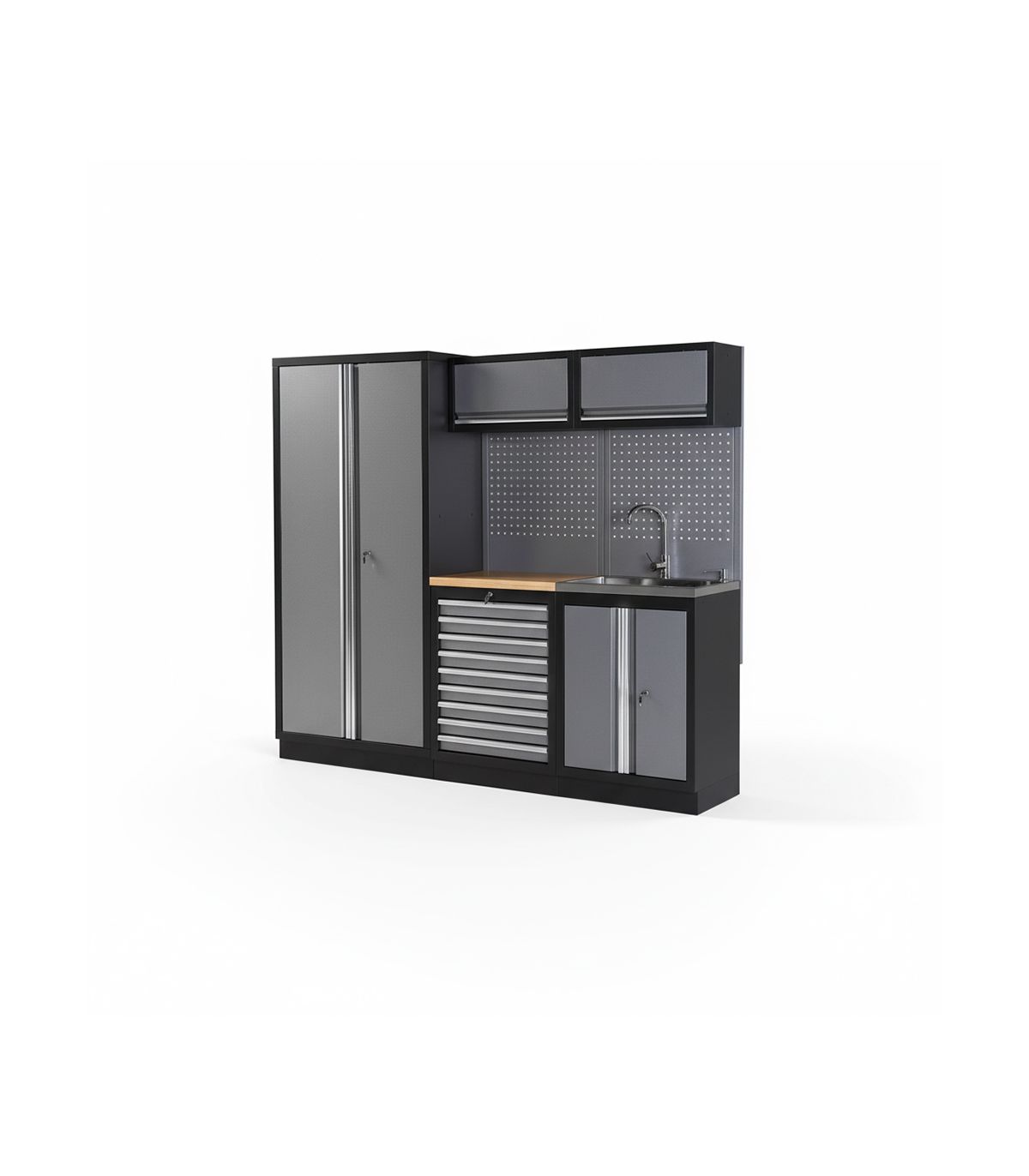 La supériorité technique de la référence 129820 repose sur son intégration intelligente. L'ensemble regroupe une armoire haute à 2 portes de 2 mètres, conçue en tôle d'acier de 0,8 mm avec quatre étagères réglables pour le matériel lourd. La partie centrale est occupée par une unité de base à 9 tiroirs montés sur glissières télescopiques à billes, permettant de classer méthodiquement douilles, clés et instruments de mesure. Le point fort est le meuble bas spécifique intégrant un évier et un robinet. Cette configuration permet au technicien de dégraisser des composants ou de se laver sans quitter son poste, augmentant drastiquement la productivité. La structure globale est stabilisée par cinq piliers de liaison arrière, assurant une rigidité indéformable à l'ensemble du système.