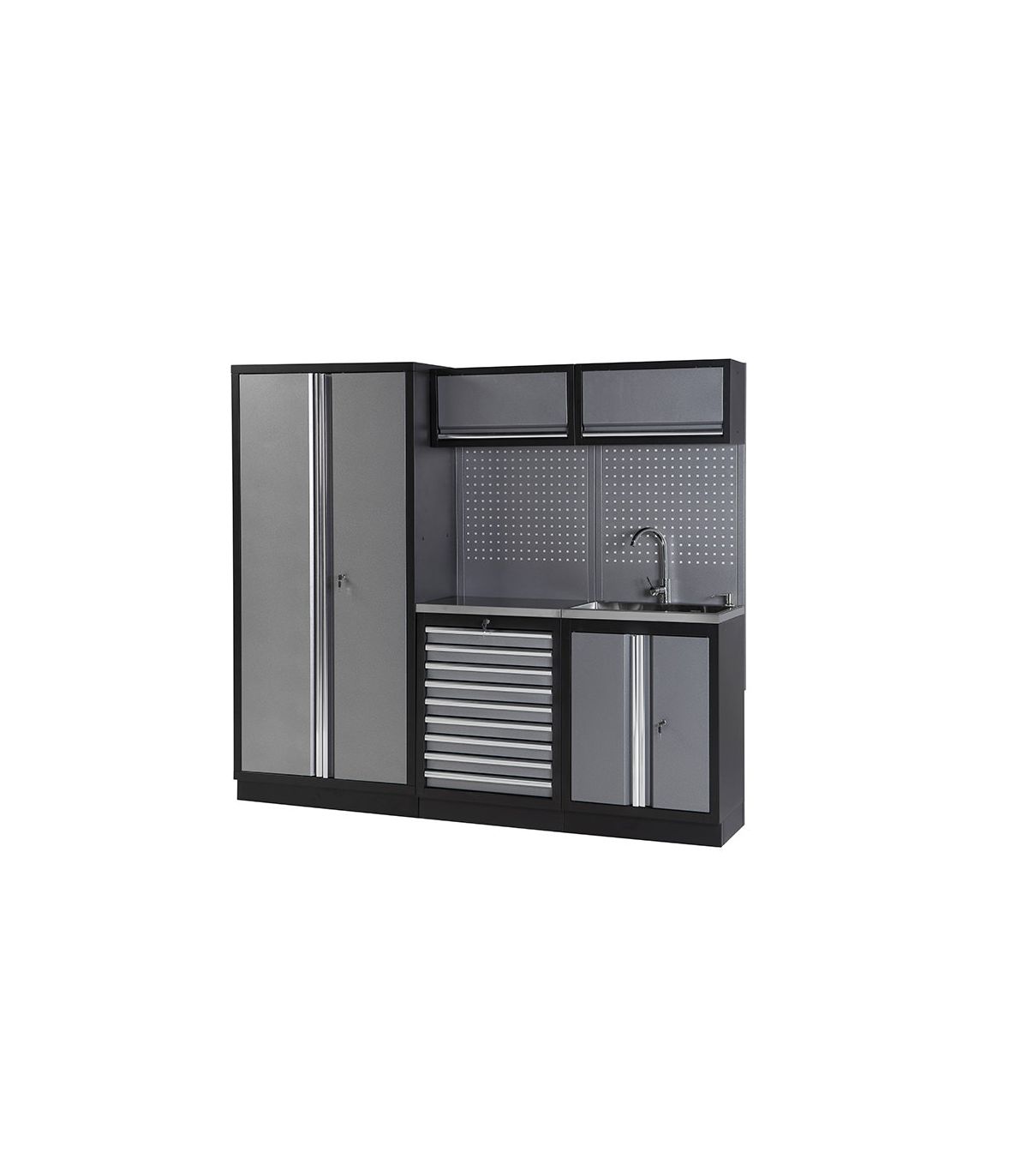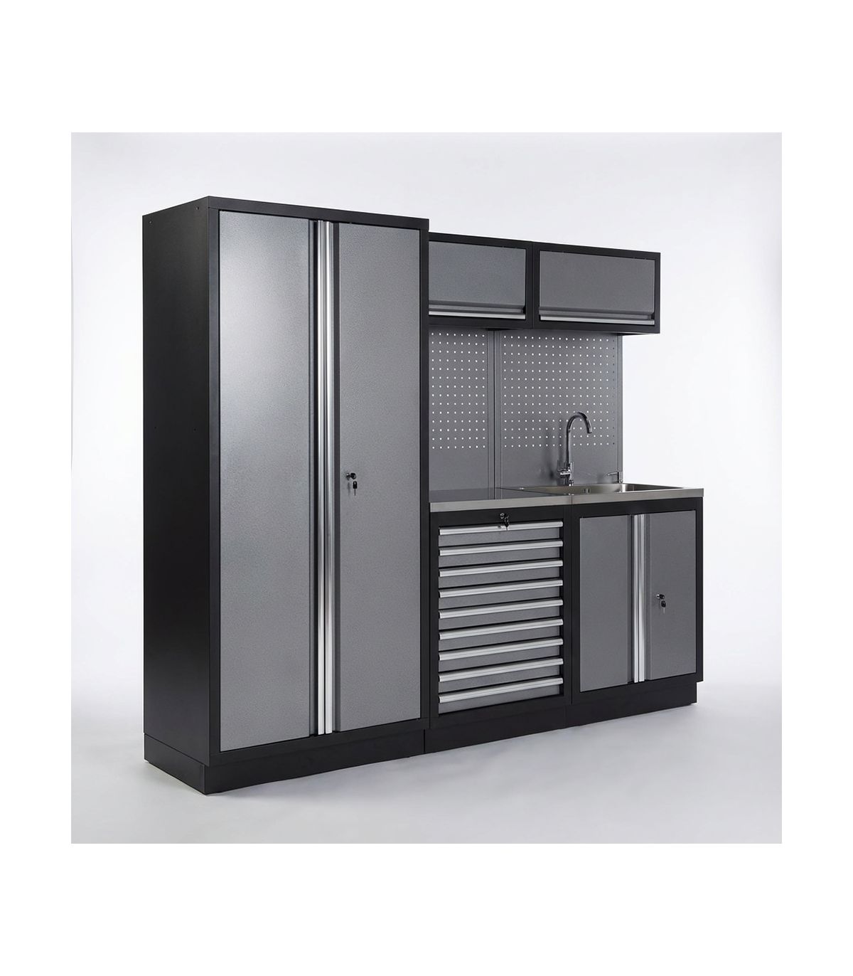 La supériorité technique de la référence 129825 réside dans son intégration hydraulique parfaite dans un environnement métallique de grade industriel. L'ensemble est structuré autour d'une armoire haute à 2 portes de 2 mètres, conçue en tôle d'acier de 0,8 mm d'épaisseur. Le plan de travail en acier inoxydable est le cœur du système : inaltérable face à l'humidité, aux huiles et aux solvants agressifs, il accueille un évier et une robinetterie complète. Cette configuration permet une maintenance propre, indispensable pour les organes mécaniques sensibles ou les systèmes hydrauliques. L'unité de base à 9 tiroirs, montés sur glissières à billes télescopiques, offre un volume de stockage exceptionnel pour classer les instruments de précision, les douilles et les clés mixtes.