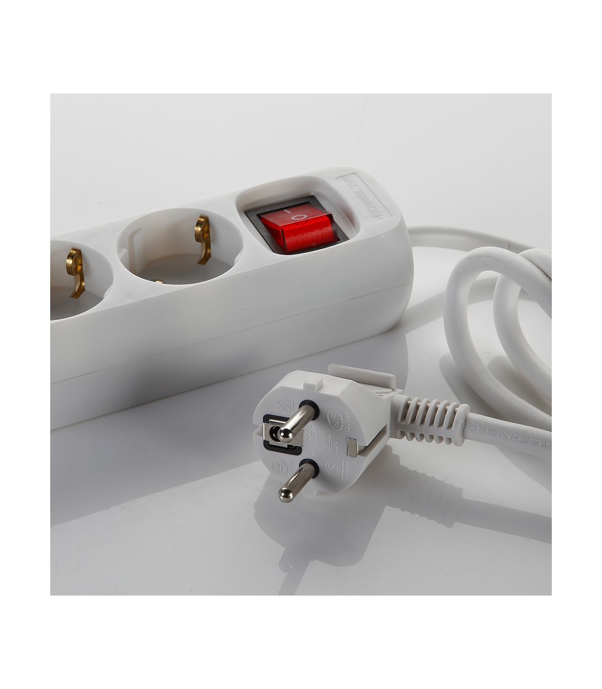 Multiprise de 3, 4, 5 ou 6 prises Schuko avec protection enfant. Elle est équipée d'un interrupteur d'alimentation avec un témoin de passage de courant. Connectée à un câble 1,5 fils de 5 mm en cuivre (3x1,3 mm), câble H05VV-F d’une intensité maximale de 16 A 230 V pour un maximum de 3 680 W. La longueur du câble est de 1,40 ou 3 m. Cette multiprise est conforme aux normes de sécurité électrique CE et GS. Conforme aux normes d'étanchéité IP20 (contre la poussière et l'humidité).