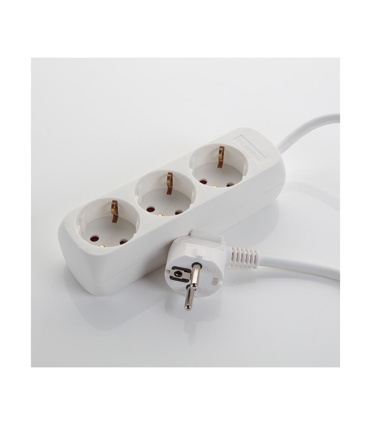Multiprise de 3, 4, 5 ou 6 prises Schuko avec protection enfant. Connectée à un câble 1,5 fils de 5 mm en cuivre (3x1,3 mm), câble H05VV-F d’une intensité maximale de 16 A 230 V pour un maximum de 3 680 W. 2 pôles et mise à la terre. La longueur du câble est de 1,4 m. Cette multiprise est conforme aux normes de sécurité électrique CE et GS. Conforme aux normes d'étanchéité IP20 (contre la poussière et l'humidité).