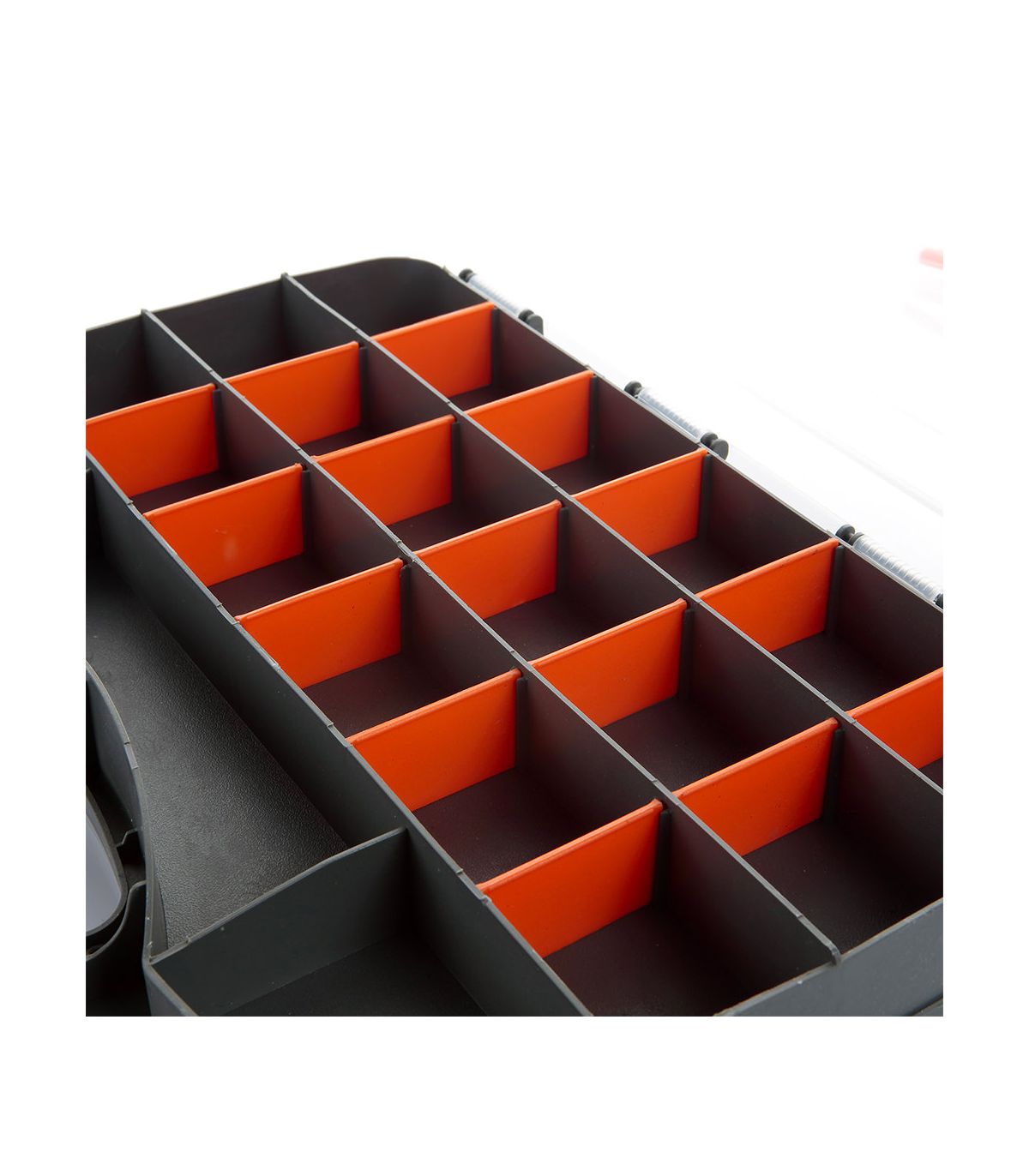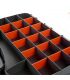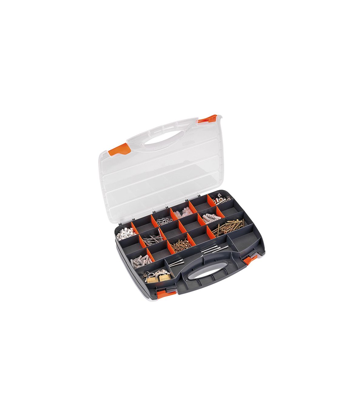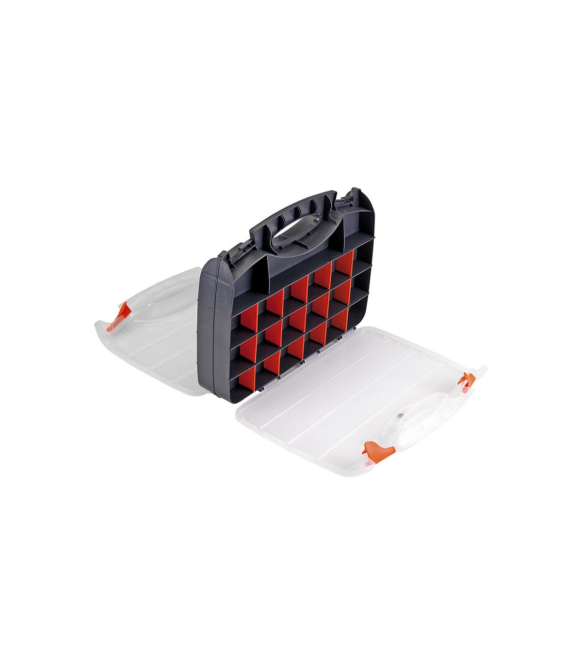 Mallette en plastique avec 2 couvercles transparents et 2 parties avec cloisons et séparateurs pour contenir les consommables, des deux côtés de la mallette. La mallette, dotée d'une poignée ergonomique et de serrures des deux côtés, comporte des divisions qui peuvent être multipliées à l'aide de séparateurs, en fonction de la taille des consommables. Les deux couvercles de la mallette (des deux côtés) permettent de voir le contenu des séparateurs et sont fixés aux rangées de séparateurs au moyen de saillies dans les couvercles, ce qui empêche le mélange accidentel du contenu. Les couvercles sont transparents et fabriqués en polycarbonate. Différentes divisions en fonction des besoins en consommables (clous, rondelles, etc.) Très utile pour le stockage et le transport de tous types de consommables. Très utile pour tous les travaux d'entretien, tant en atelier que pour l'entretien extérieur, les installations, les montages, etc.