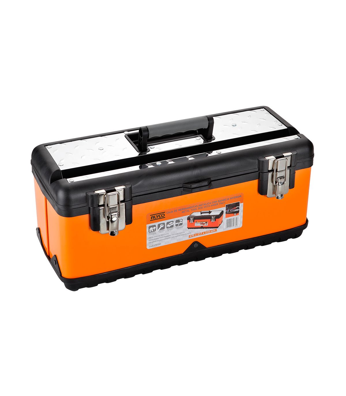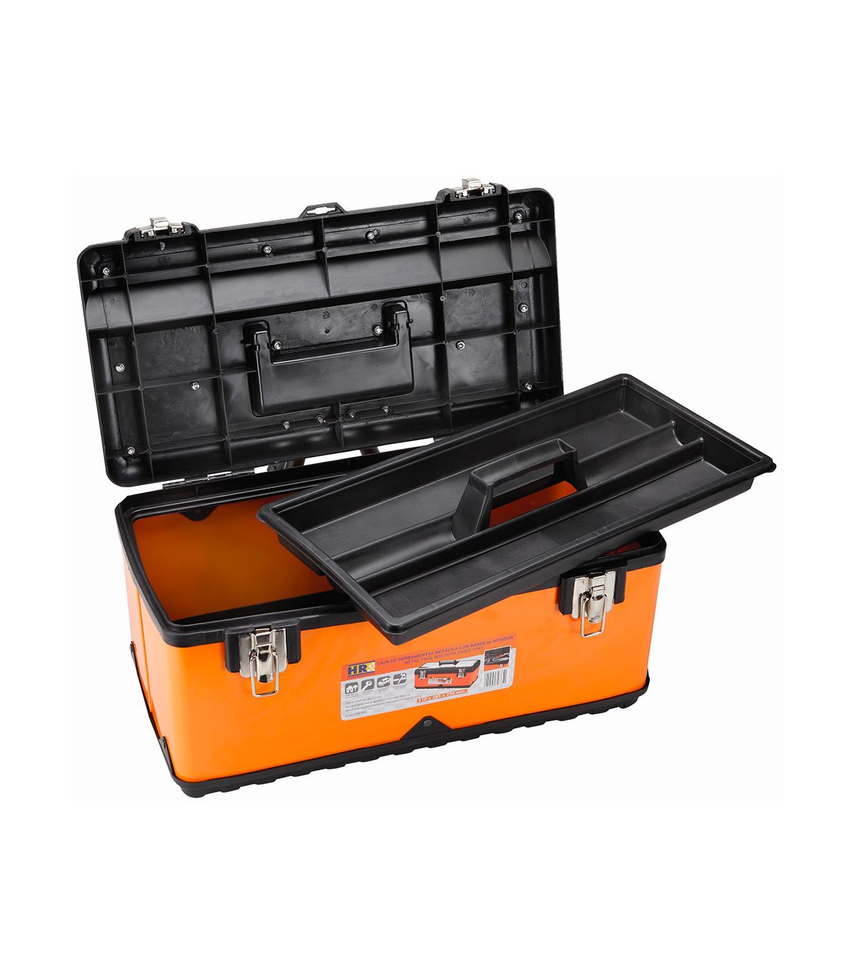 Boîte à structure en métal et plastique avec plateau intérieur amovible. Avec une base en plastique renforcé, des parois métalliques et un couvercle à structure en plastique renforcé. Avec 2 serrures de sécurité en métal et un trou pour cadenas. Boîte de structure métallique de 0,5 mm avec renforts et rivets sur tous les bords. Couvercle avec partie métallique en inox de 0,3 mm d'épaisseur et poignée ergonomique pliable en plastique. Plateau intérieur en plastique qui s'adapte aux saillies de la boîte, pour couvrir les outils, et pour placer des outils ou des consommables dessus. Poignée en plastique. Très utile pour le rangement et le transport de toutes sortes d'outils. Permet le stockage d'outils car peut être verrouillée. Très utile pour tous les travaux d'entretien, tant en atelier que pour l'entretien extérieur, les installations, les montages, etc.