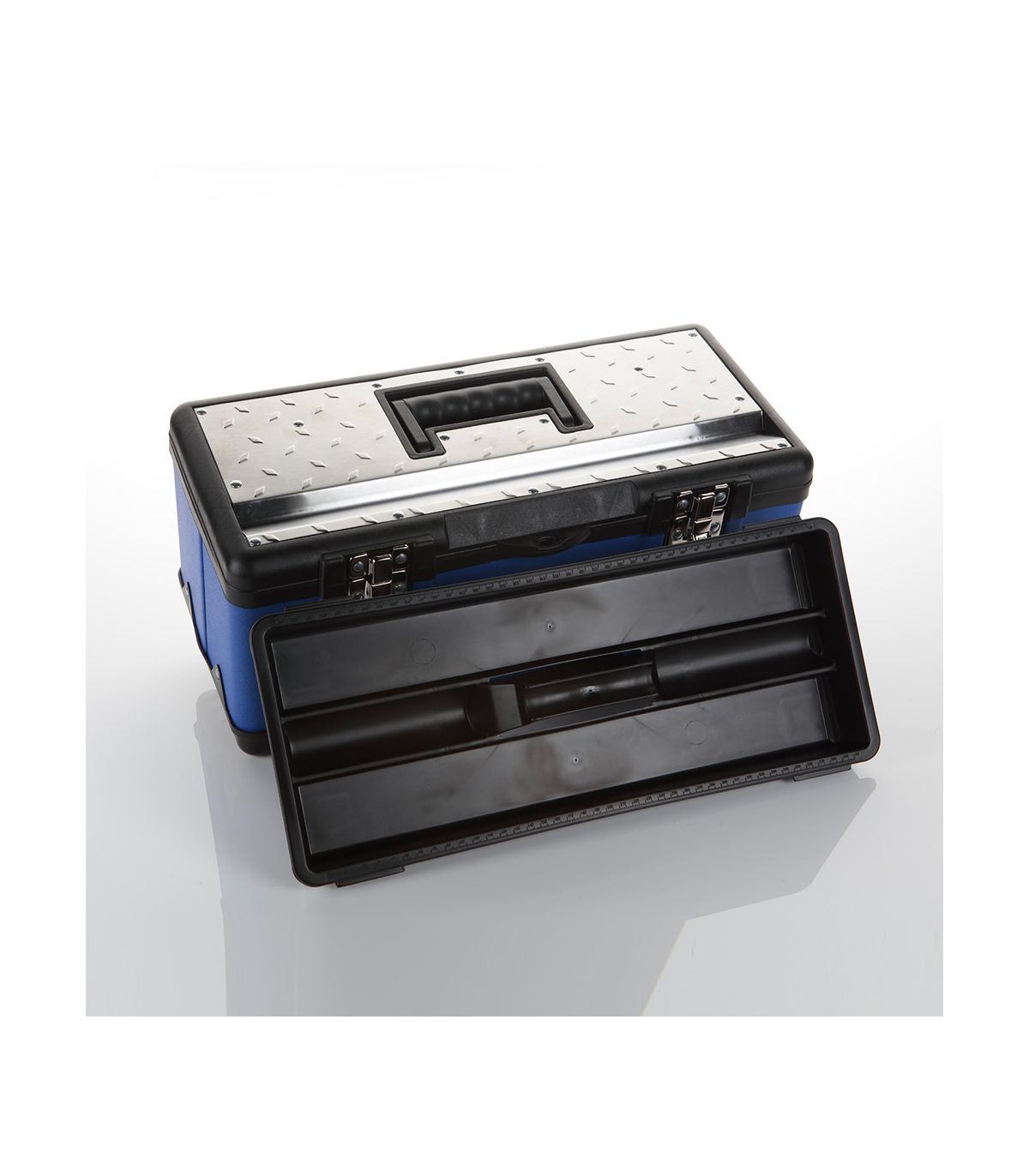 Boîte à structure en métal et plastique avec plateau intérieur amovible. Avec une base en plastique renforcé, des parois métalliques et un couvercle à structure en plastique renforcé. Avec 2 serrures de sécurité en métal et un trou pour cadenas. Boîte de structure métallique avec renforts et rivets sur tous les bords. Couvercle avec partie métallique et poignée ergonomique pliable en plastique. Plateau intérieur en plastique qui s'adapte aux saillies de la boîte, pour couvrir les outils, et pour placer des outils ou des consommables dessus. Poignée en plastique. Très utile pour le rangement et le transport de toutes sortes d'outils. Permet le stockage d'outils car peut être verrouillée. Très utile pour tous les travaux d'entretien, tant en atelier que pour l'entretien extérieur, les installations, les montages, etc.