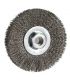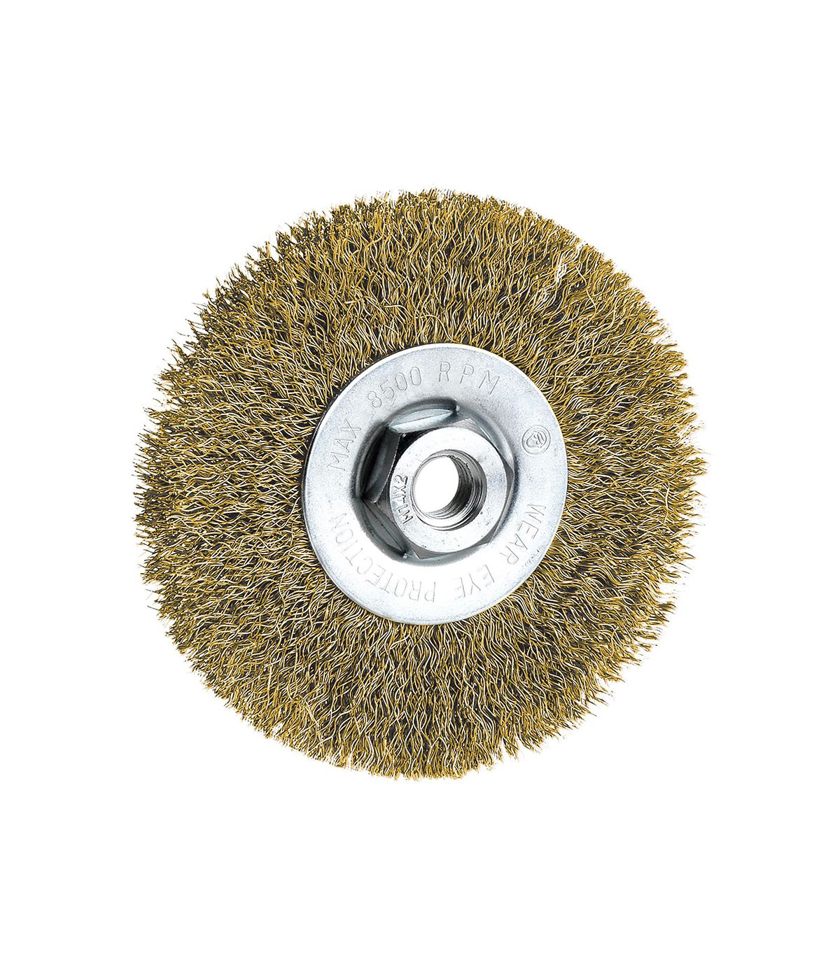 Brosse métallique circulaire pour meuleuses, convient pour enlever tous les types de rouille, de peinture et de bavures.Parfaite pour nettoyer la calamine des pièces forgées et moulées.Elle est dotée d'une fixation par vis filetée (M14) qui garantit une connexion correcte avec l'outil.Fil en laiton ou en inox, serti, d'une épaisseur de 0,30 mm.Fabriquée avec des matériaux de qualité, ce qui garantit sa résistance et la durée de vie utile du produit.
