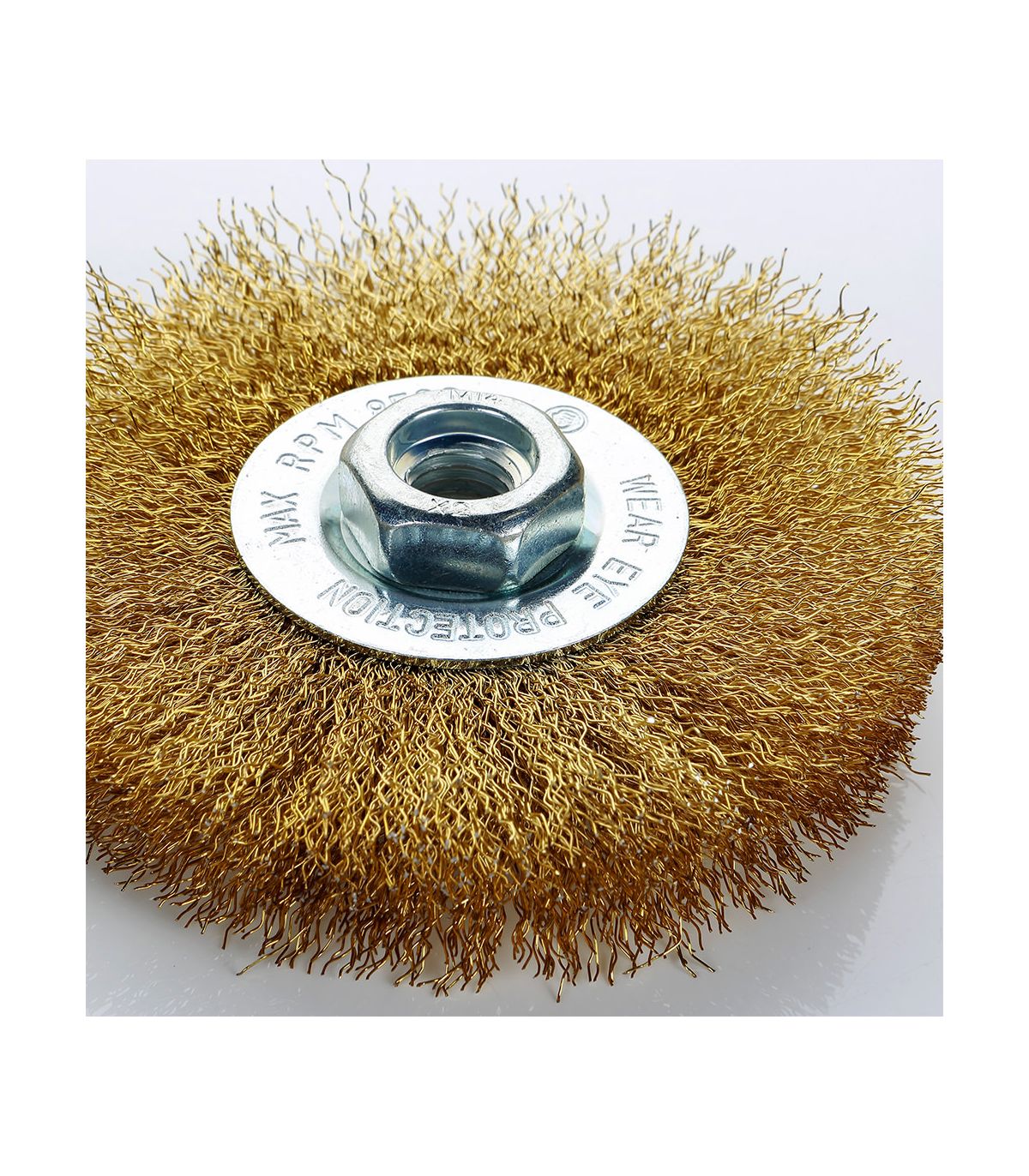 Brosse métallique circulaire pour meuleuses, convient pour enlever tous les types de rouille, de peinture et de bavures. Idéale pour nettoyer la calamine sur les pièces forgées et moulées. Le type de fil de la brosse est en laiton ou en inox de haute qualité, ce qui garantit une bonne durée de vie et une élimination complète de la saleté et de la rouille. Il est également ondulé et présente une épaisseur optimale (0,30 mm) pour les tâches de nettoyage. Elle est dotée d'une douille de serrage filetée (M14) qui assure une articulation parfaite entre la brosse et la meuleuse. Il s’agit de l'outil parfait pour les travaux professionnels qui nécessitent un outil efficace et confortable.