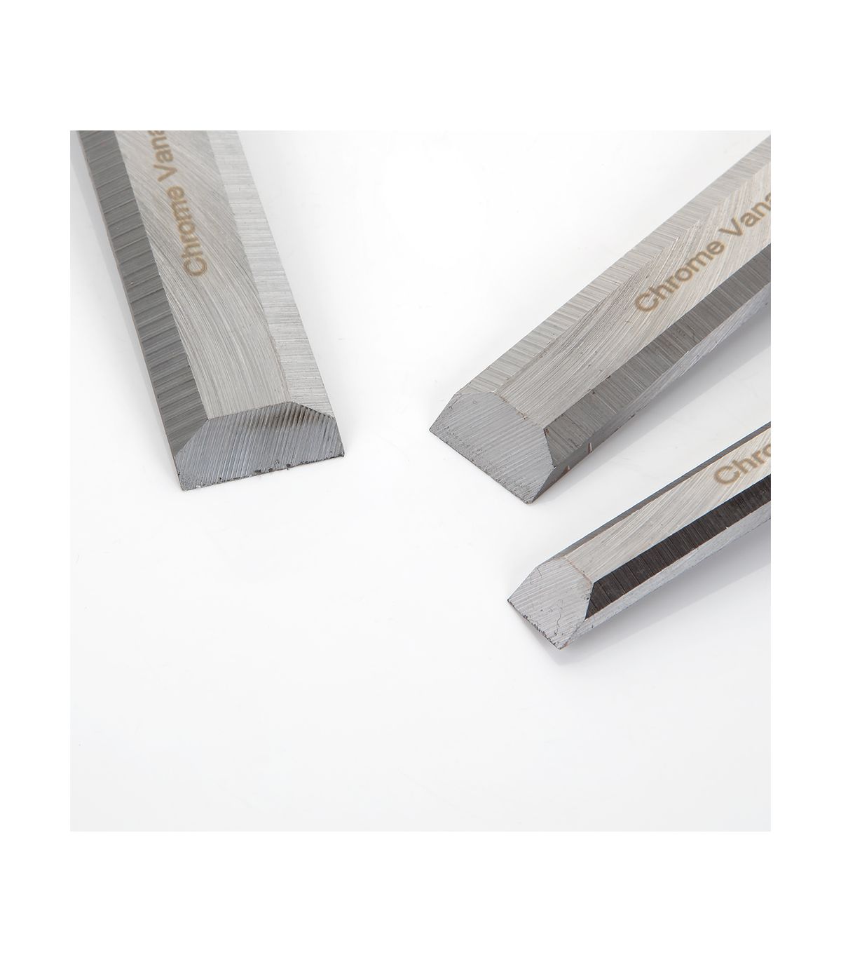 Set de 3 burins de 12, 20 y 25 mm, parfaits pour de multiples usages de frappe et de découpe. Fabriqués en acier chrome vanadium, pour une qualité et une robustesse garanties.Ergonomie et efficacité de frappe. Manche ergonomique en plastique ou en bois, parfaitement fixé à la lame.Excellente transmission de l'effort. Renfort métallique pour la frappe.Parfait pour découper et sculpter le bois, le plastique et le métal. Surface de lame rectifiée pour plus de précision et de résistance.Longue durée de vie : bord tranchant réaffûtable et traitement à l’huile pour éviter la rouille. Fourni avec un protège-bords pour plus de sécurité lors du transport ou du stockage.