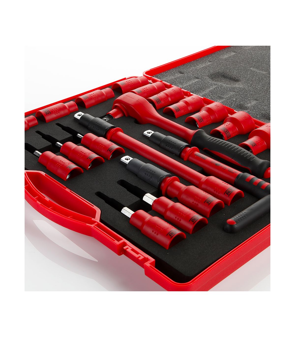 La supériorité technique de la référence 190300 repose sur son isolation multicouche haute performance appliquée sur chaque composant. Chaque douille, rallonge et cliquet est testé individuellement à 10 000V avant sa mise sur le marché, conformément à la norme CEI 60900. L'acier Chrome Vanadium (CrV) forgé assure la transmission des couples de serrage élevés nécessaires pour les connexions de puissance, tandis que le revêtement isolant protège l'utilisateur contre les arcs électriques et les contacts accidentels. Le système de verrouillage des douilles garantit qu'aucune pièce métallique ne puisse tomber dans une armoire sous tension pendant la manipulation.