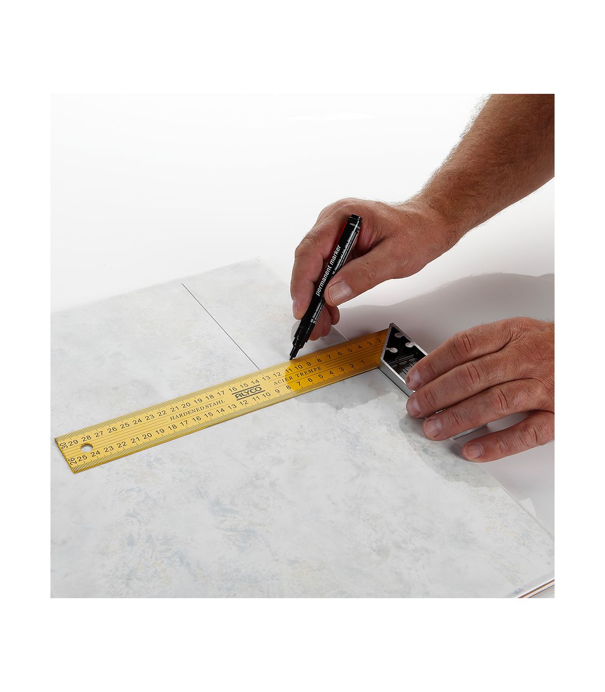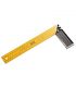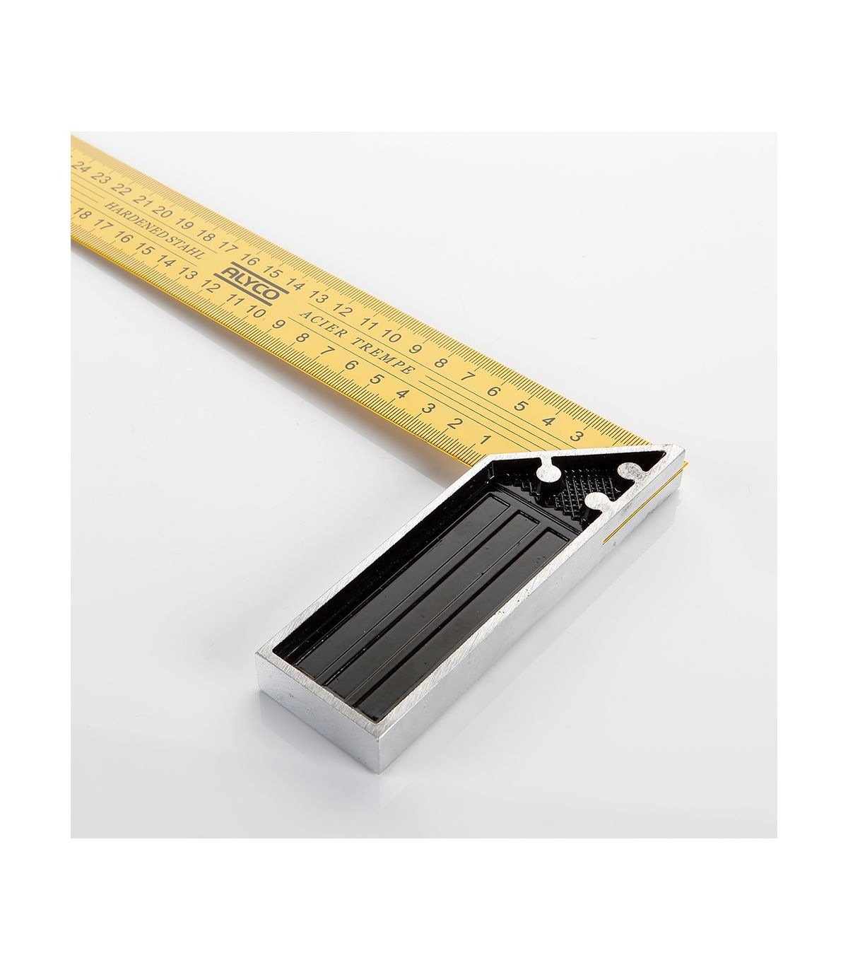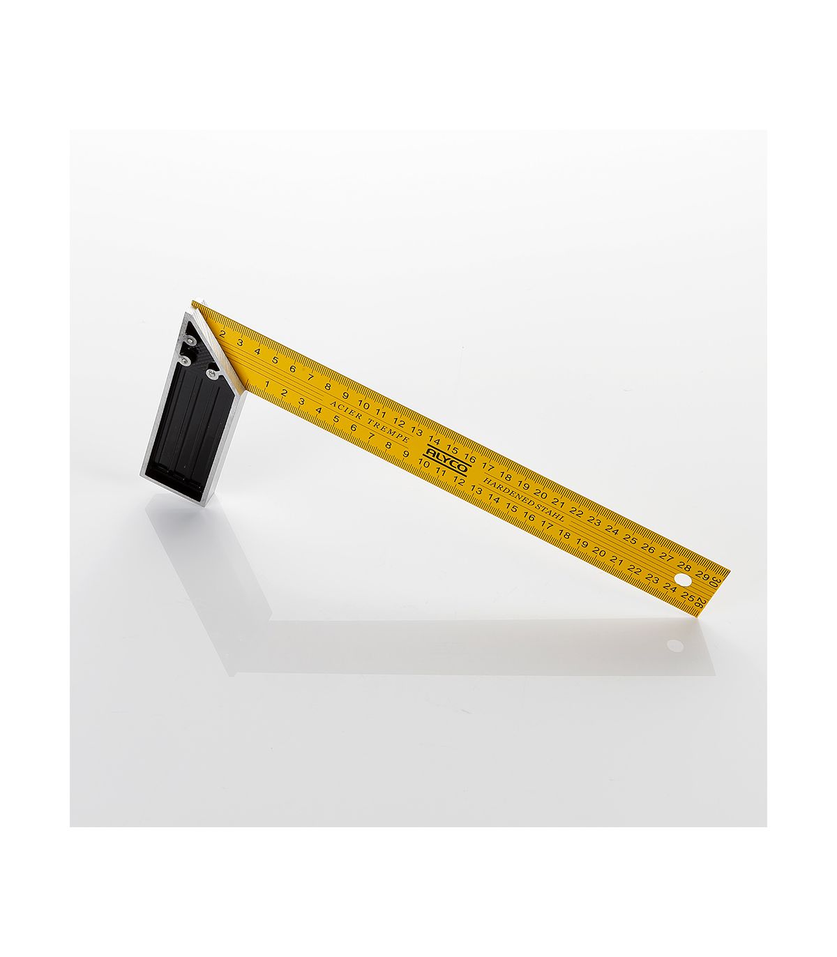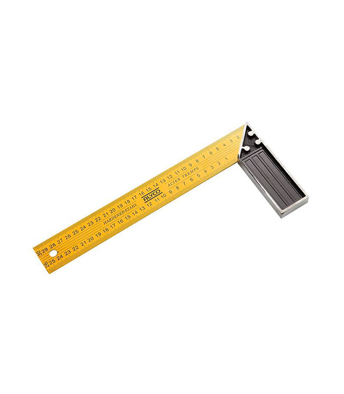 La lame de cette équerre est en acier trempé et est marquée en mm sur les deux côtés. L'équerre est conçue pour une lecture facile. Le manche est en aluminium pour rendre l'outil plus léger et plus facile à manipuler. La liaison entre la lame et le manche est réalisée par des rivets.