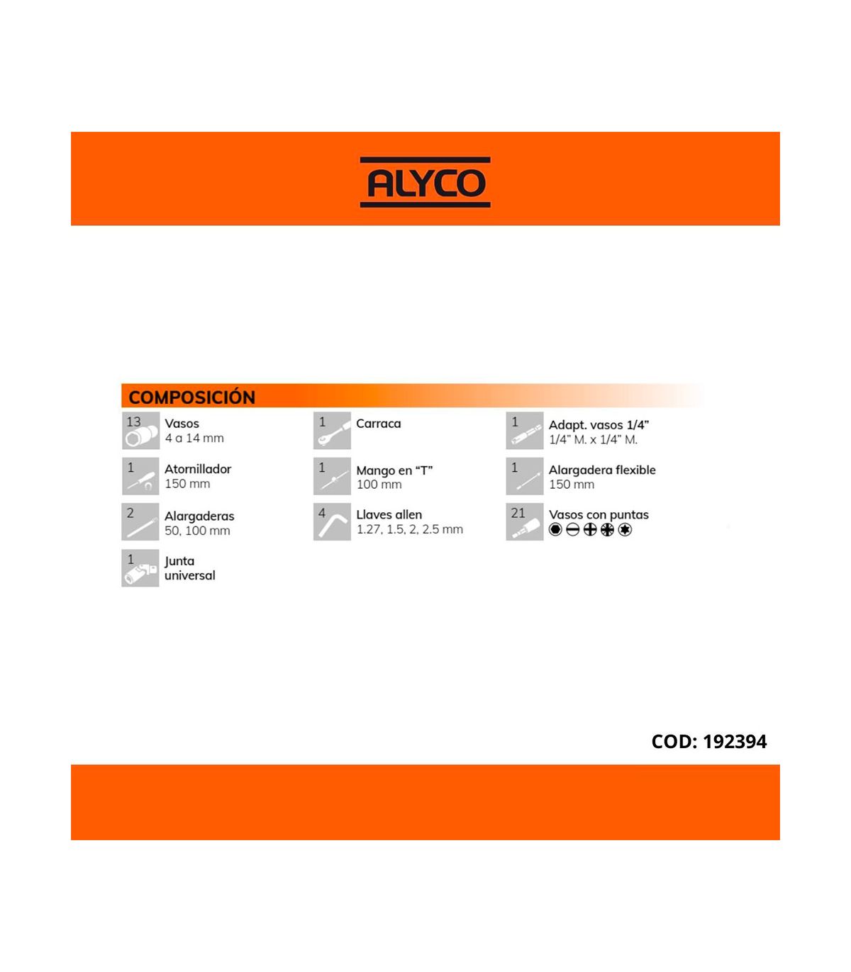 Ce set de 46 pièces se distingue par l'intégration de douilles-embouts. Contrairement aux systèmes à adaptateurs fragiles, les embouts (Torx, Hexagonaux, Phillips, Pozidriv, Plat) sont directement sertis sur la douille 1/4", garantissant une rigidité totale et une précision de vissage accrue. Le coffret est également doté d'accessoires de transmission indispensables : rallonges rigides de différentes longueurs, cardan universel pour les accès angulaires et, surtout, une rallonge flexible permettant de contourner les obstacles fixes pour atteindre les vis les plus cachées. En choisissant Alyco Orange, vous investissez dans un matériel d'élite qui valorise votre réactivité technique et garantit une précision de geste constante sur toutes vos opérations de micro-mécanique.