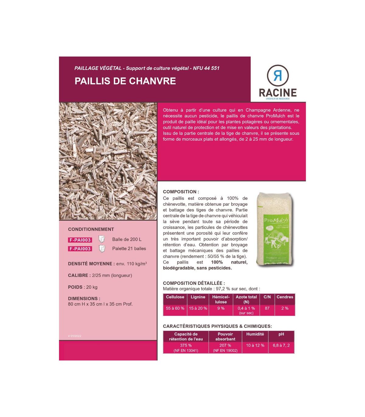 - Paillis de chanvre 100 % naturel, biodégradable et sans pesticides, conforme à la norme NFU 44-551.