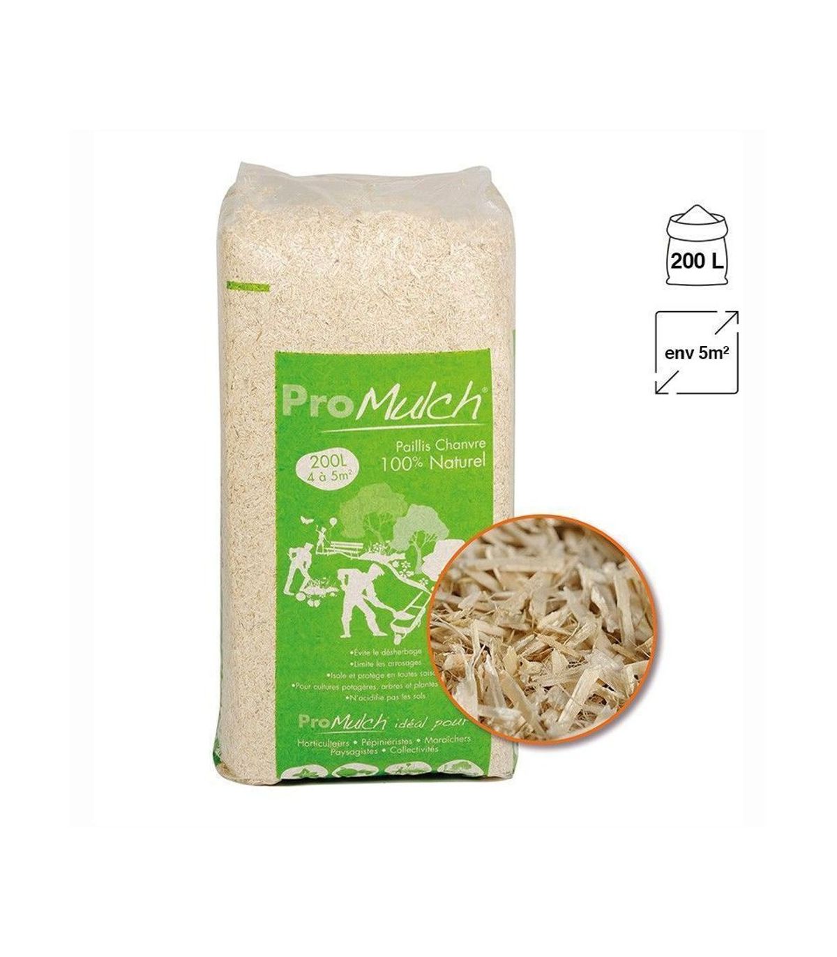 Le paillis de chanvre ProMulch, issu de cultures sans pesticides en Champagne-Ardenne, est un paillage végétal idéal pour les plantes potagères et ornementales. Composé de chènevotte 100 % naturelle, obtenue par le broyage de la tige centrale du chanvre, ce paillis retient efficacement l'humidité, grâce à sa capacité de rétention d’eau de 375 % et son pouvoir absorbant de 207 %. Son calibre, de 2 à 25 mm, crée une couverture homogène qui protège les cultures et assure une réduction de l'évaporation.