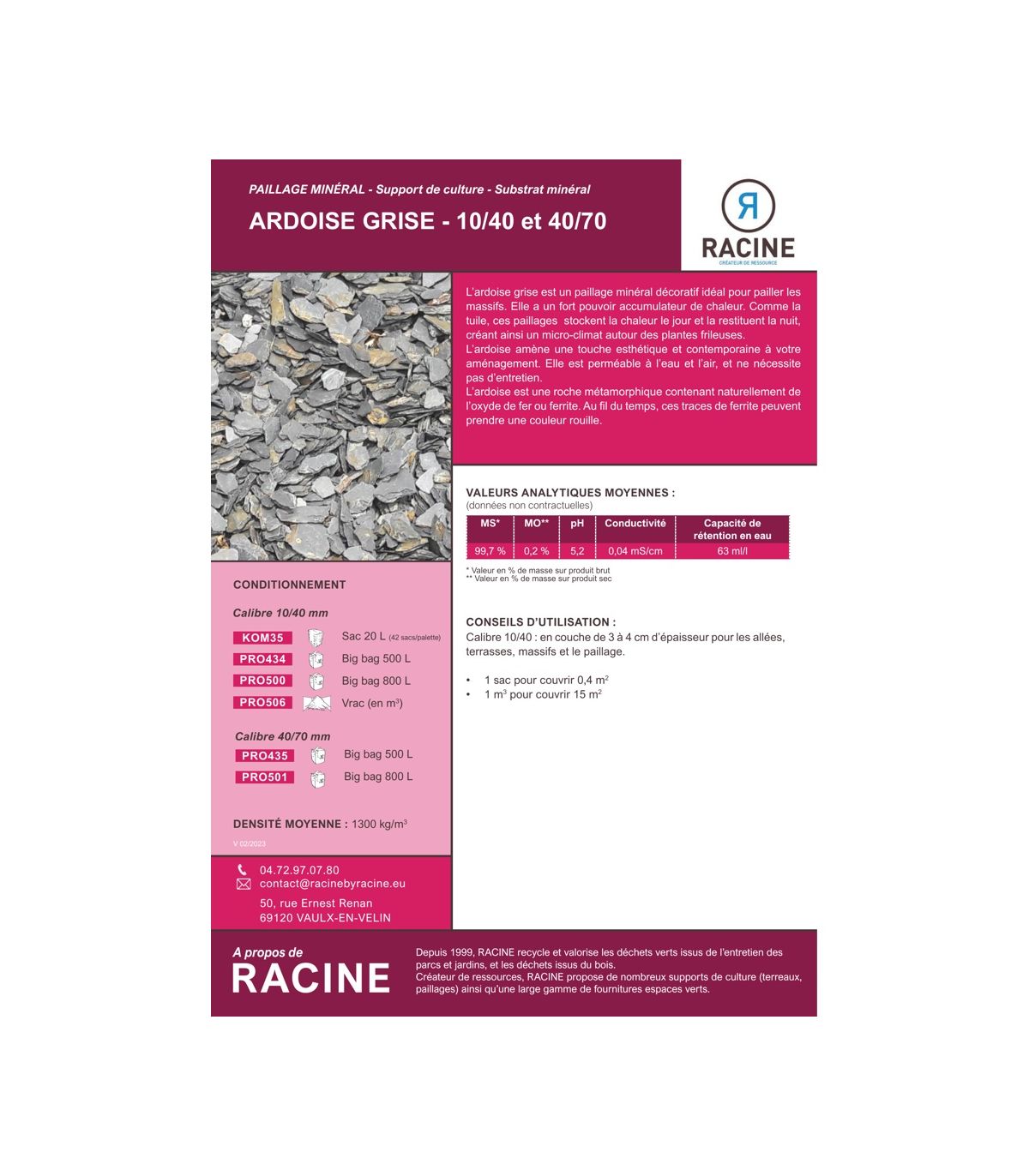 - Calibre 10/40: en couche de 3 à 4 cm d'épaisseur pour les allées, terrasses, massifs et le paillage.