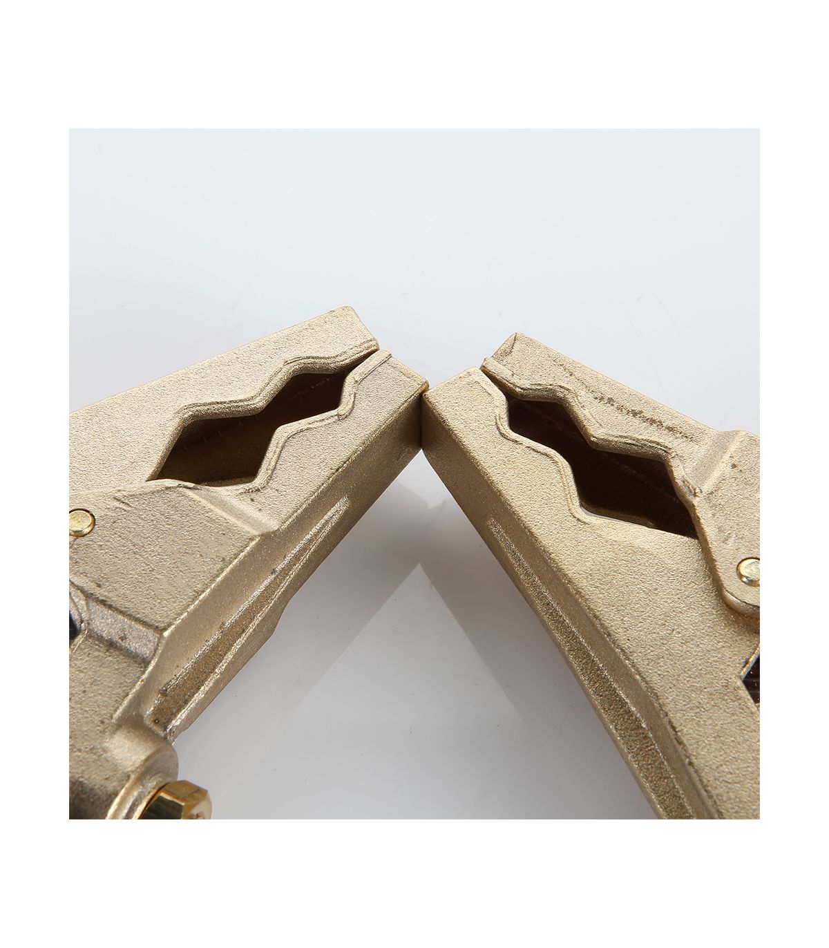 La supériorité technique de la référence 199370 réside dans l'utilisation du bronze. Contrairement aux pinces en acier cuivré qui s'oxydent et perdent leur efficacité, le bronze conserve une conductivité électrique exceptionnelle même sous des températures élevées. Sa résistance naturelle aux projections de soudure évite que les mâchoires ne s'encrassent, garantissant un point de contact net intervention après intervention. Une tresse de cuivre interne relie les deux mâchoires, assurant que le courant circule de manière symétrique et fluide, ce qui est crucial pour maintenir un arc stable, particulièrement lors de soudures à forte intensité (jusqu'à 800A).