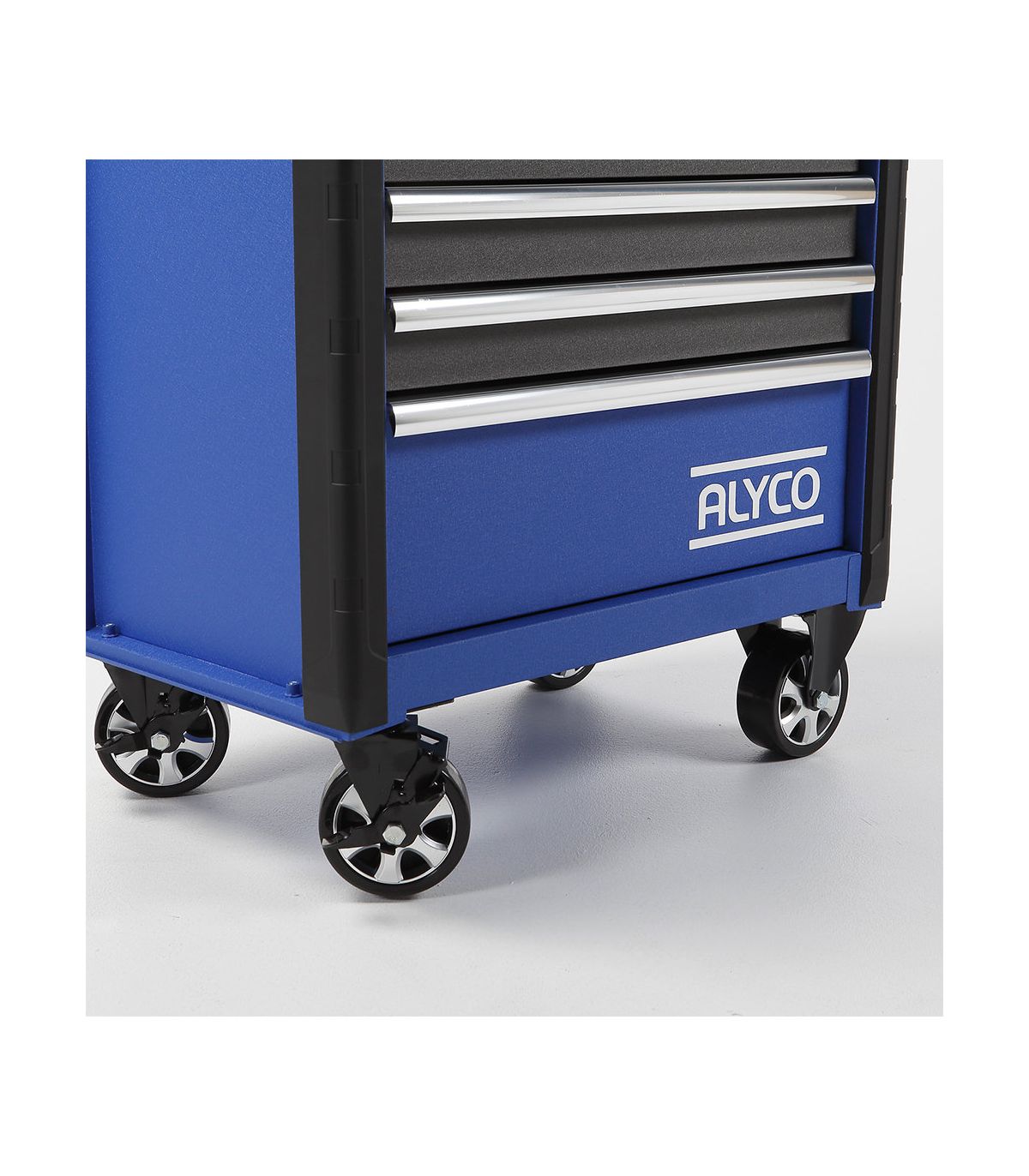 La servante 129725 a été pensée pour être au plus proche de vos besoins opérationnels. Dotée de quatre roues de qualité industrielle (130 mm), elle se déplace avec une agilité surprenante malgré son volume. Les deux roues pivotantes permettent un guidage précis entre les machines et les véhicules, tandis que les freins immobilisent fermement la servante pour créer un poste de travail stable. Pour la sécurité, Alyco a intégré un verrouillage centralisé robuste : d'un seul tour de clé, vous condamnez l'accès aux 7 tiroirs, protégeant ainsi votre investissement contre les pertes et les utilisations non autorisées. La poignée ergonomique latérale assure une manœuvrabilité parfaite en toute sécurité, même lorsque le chariot est chargé à sa capacité maximale de 300 kg.