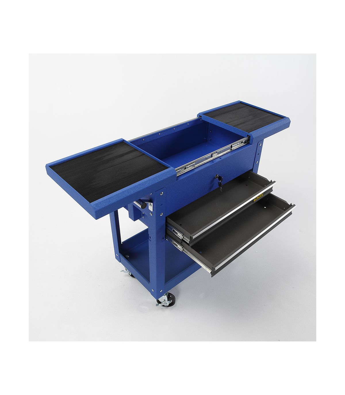 La supériorité technique de la référence 192780 repose sur sa structure en tôle d'acier renforcée. La partie supérieure offre un volume libre généreux, tandis que les tiroirs frontaux, montés sur des glissières télescopiques à roulements à billes, permettent d'organiser méthodiquement le petit outillage. Cette bi-partition du stockage assure que chaque type d'outil trouve sa place idéale. L'ouverture par le haut peut également servir de plan de travail temporaire ou de zone de dépose sécurisée pendant l'intervention grâce aux rebords du couvercle.