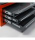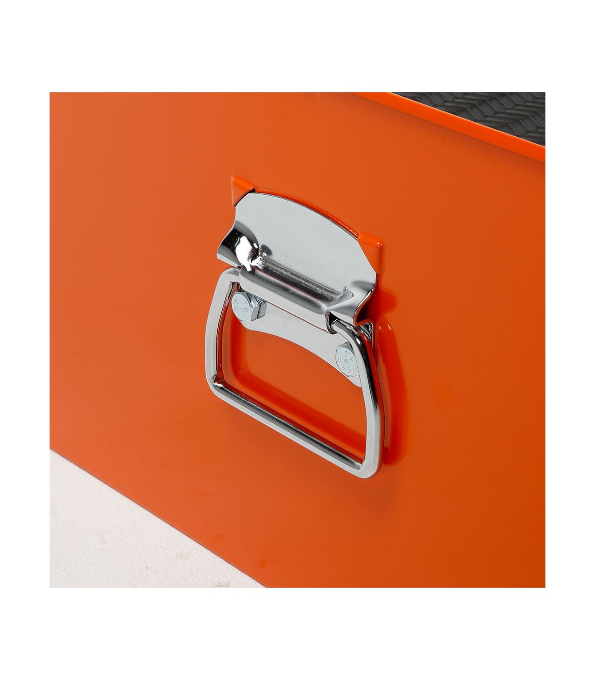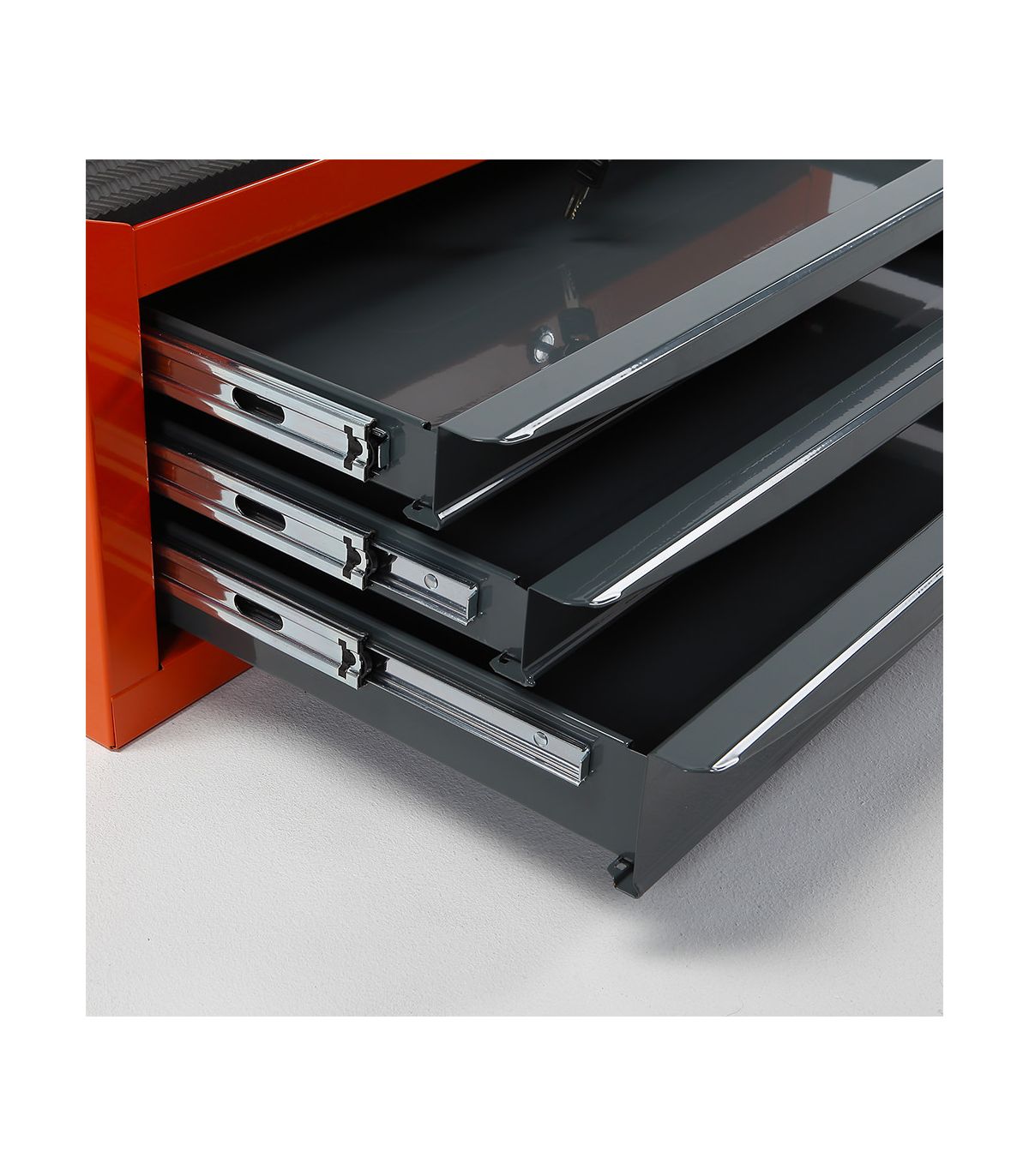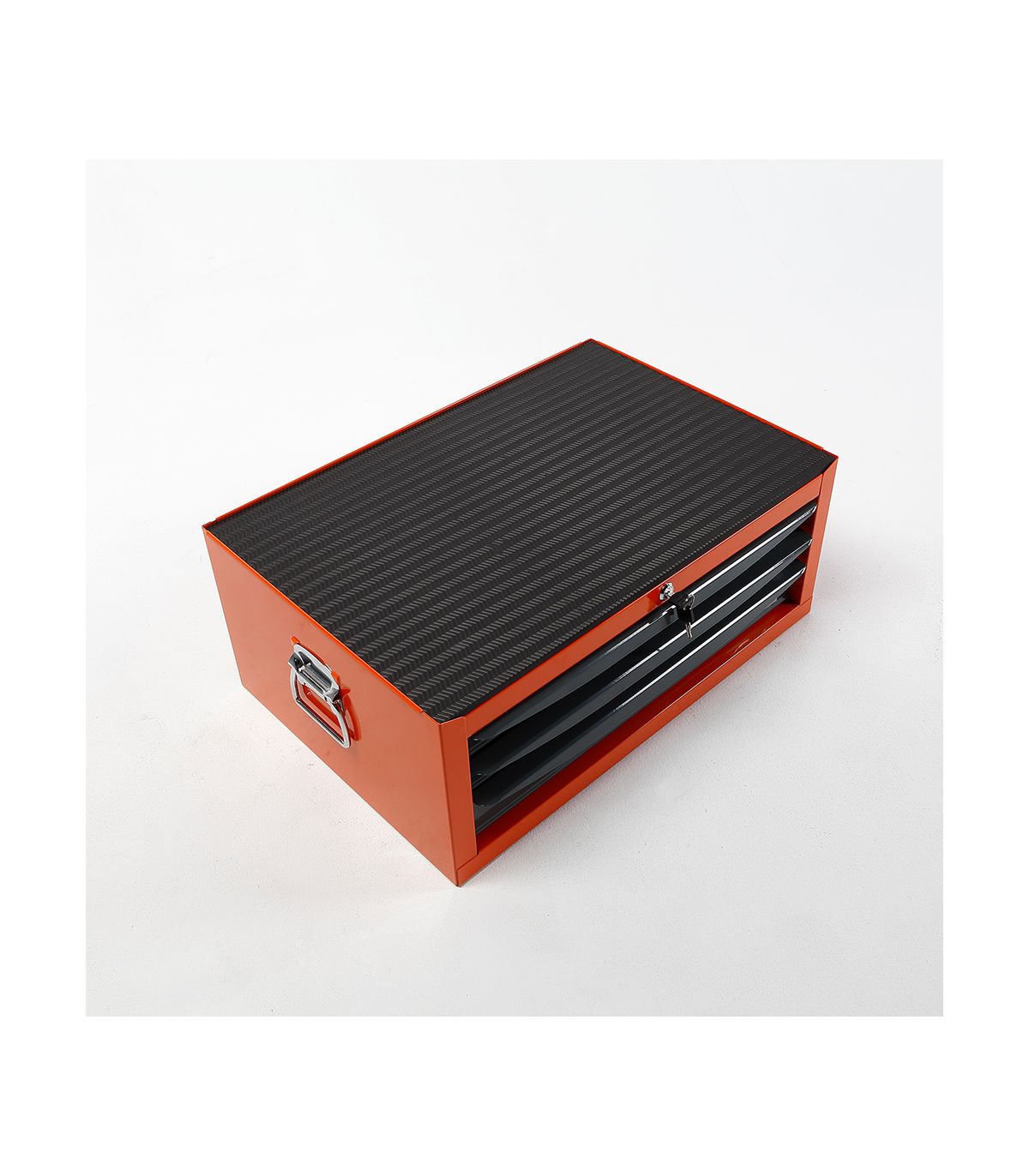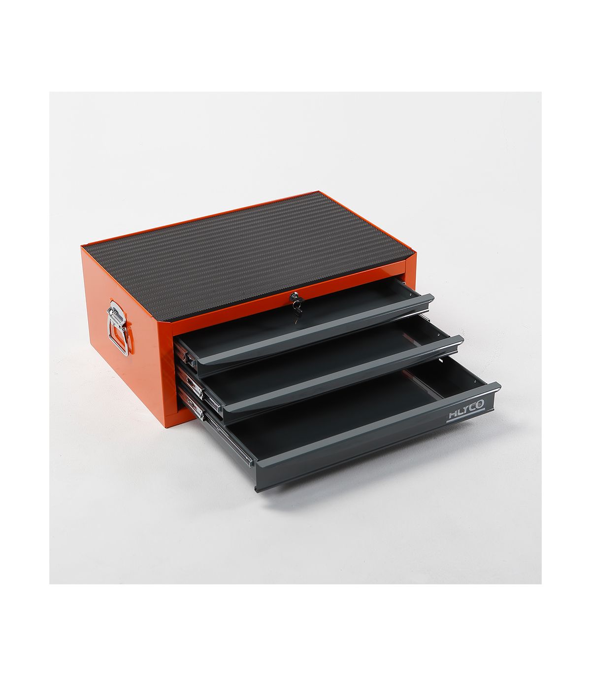 Coffre métallique à 3 tiroirs en tôle d'acier 0,8 mm, très résistant aux chocs, lui conférant une charge maximale de 75 kg.Tiroirs avec glissières à billes pour une ouverture sans effort.Convient pour être installé sur le dessus des chariots à outils ALYCO ORANGE.Rangement sécurisé des outils grâce à la serrure centrale avec 2 clés.Coffre de rangement d'outils très utile. Léger et facile à transporter grâce à ses deux poignées.