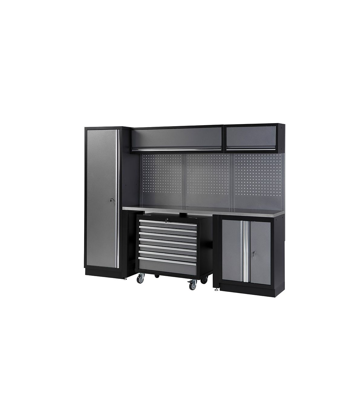- Configuration Industrielle Premium : Comprend une armoire haute de 2m, un meuble mobile à 7 tiroirs, un meuble bas à 2 portes et des rangements de plafond.