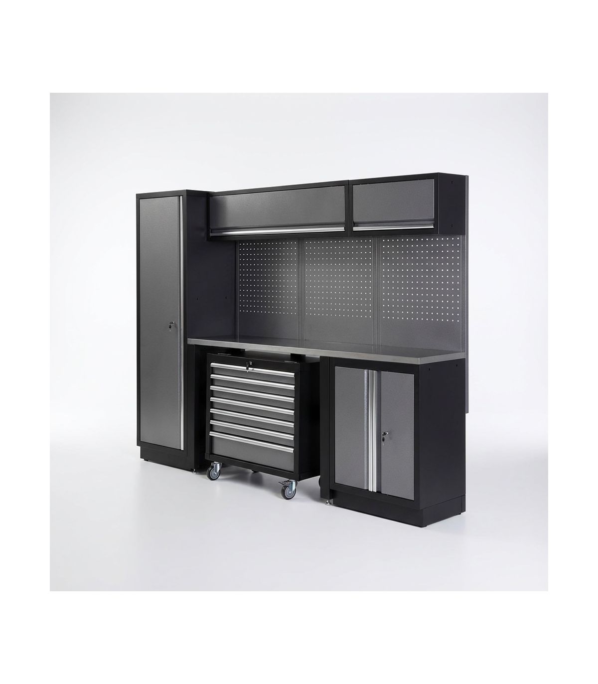Le plan de travail en acier inoxydable est l'élément central de cet ensemble. Inaltérable et facile à nettoyer, il permet de réaliser des opérations de dégraissage ou de montage de précision sans risque de contamination. Pour l'organisation des outils à main, le système comprend trois panneaux perforés à maillage carré (10x10 mm), permettant une disposition personnalisée via des crochets ou supports magnétiques. Les deux casiers de plafond, équipés de pistons à gaz, offrent un volume de rangement supplémentaire en hauteur sans encombrer la zone de travail. L'ouverture vers le haut facilite l'accès permanent aux consommables. Avec un poids total de 251 kg, cet ensemble modulaire garantit une inertie mécanique qui élimine les vibrations parasites lors de l'utilisation d'outils de force.