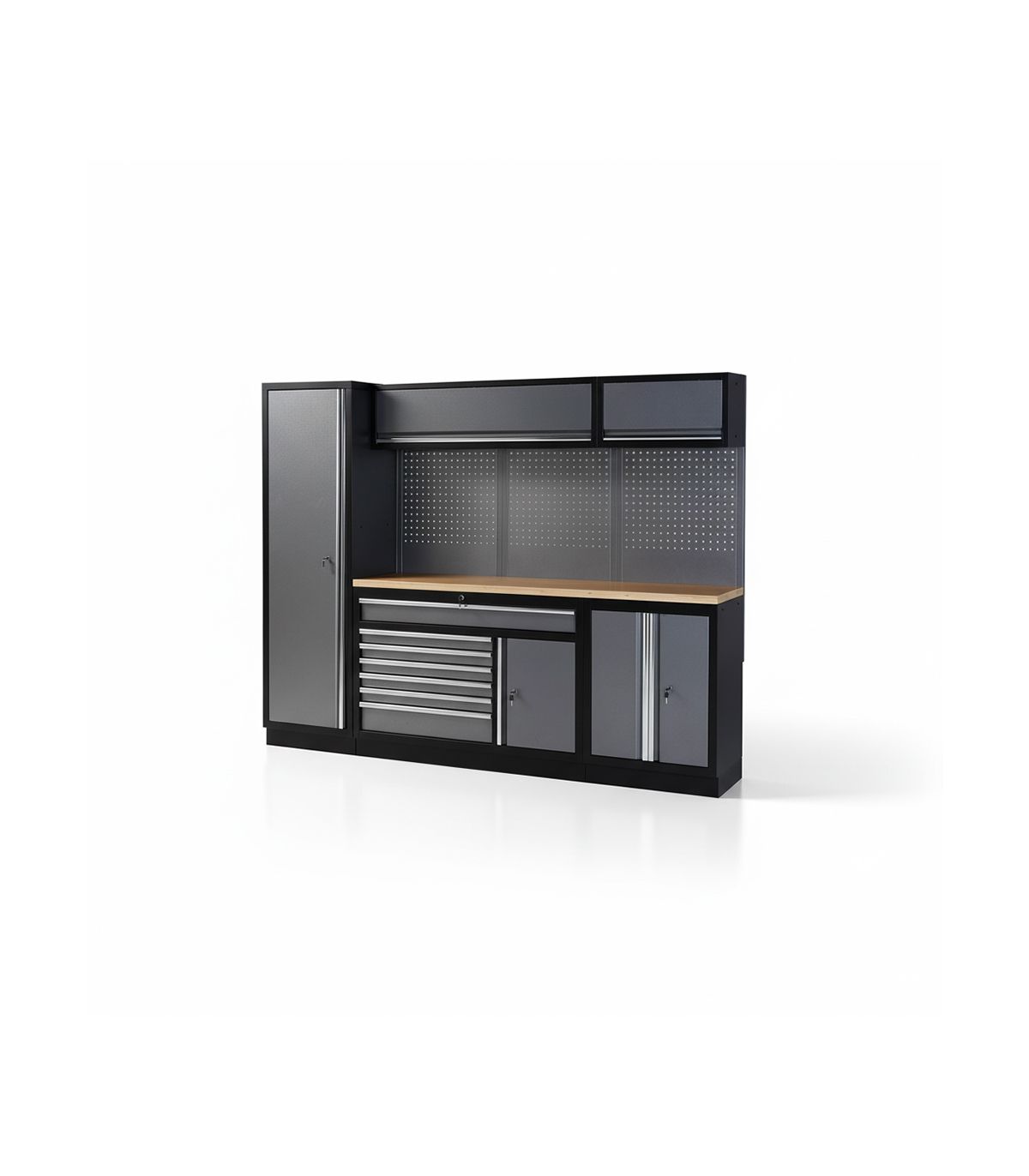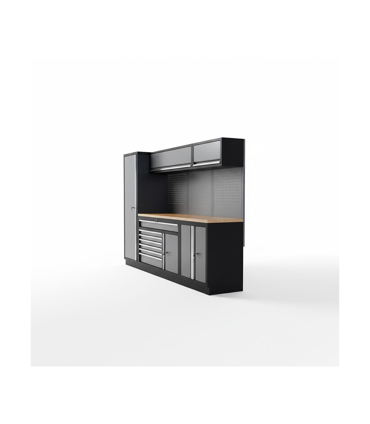 - Configuration Fixe Robuste : Inclut une armoire haute (2m), un établi fixe double module, un meuble bas à 2 portes et des rangements hauts.