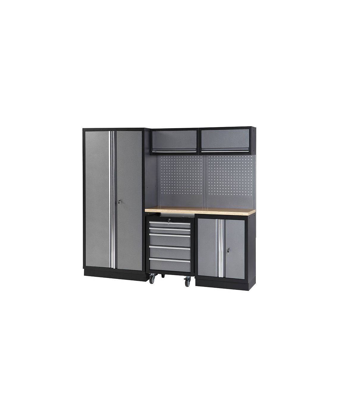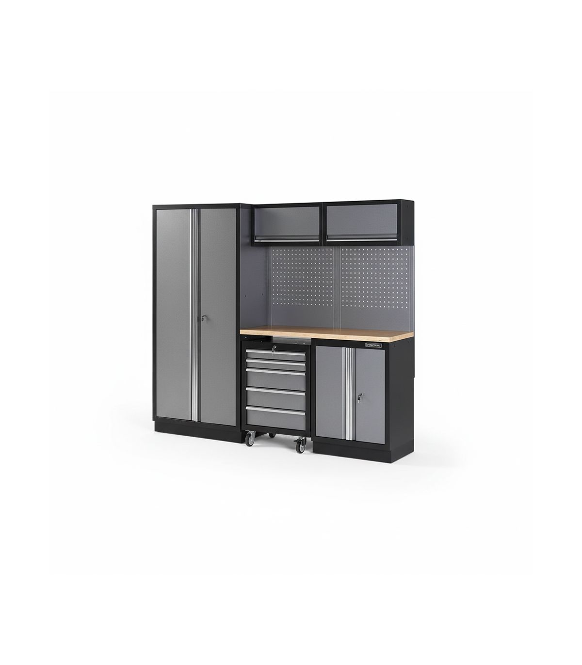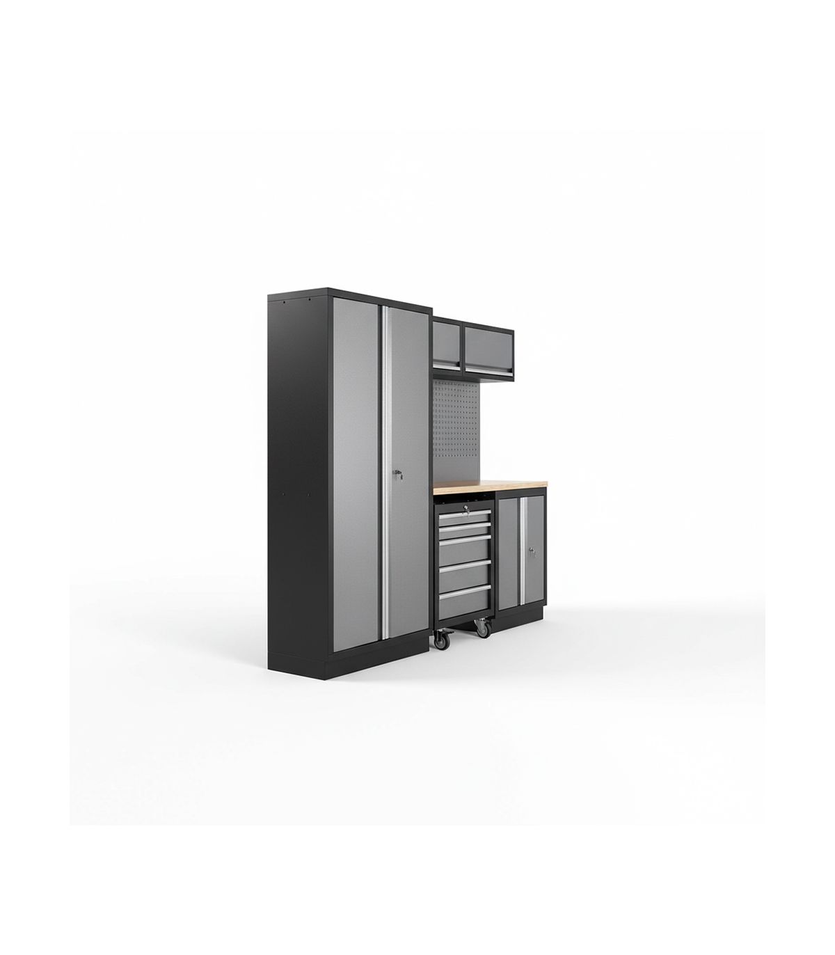 La supériorité technique de la référence 129830 réside dans sa structure en acier de 0,8 mm renforcée par cinq piliers de liaison arrière. Cette armature garantit une rigidité exemplaire pour un poids total de 205 kg, assurant que l'ensemble reste parfaitement stable même sous forte sollicitation mécanique. L'armoire haute de 2 mètres à deux portes constitue le pilier du stockage vertical, offrant quatre étagères spacieuses pour les outils encombrants ou les stocks de pièces. L'élément clé de ce pack est son module bas à 5 tiroirs sur roues. Ce meuble extractible permet au professionnel de disposer de ses douilles et clés au plus près de la zone de travail, puis de le réintégrer sous l'établi en fin de journée pour libérer l'espace au sol.
