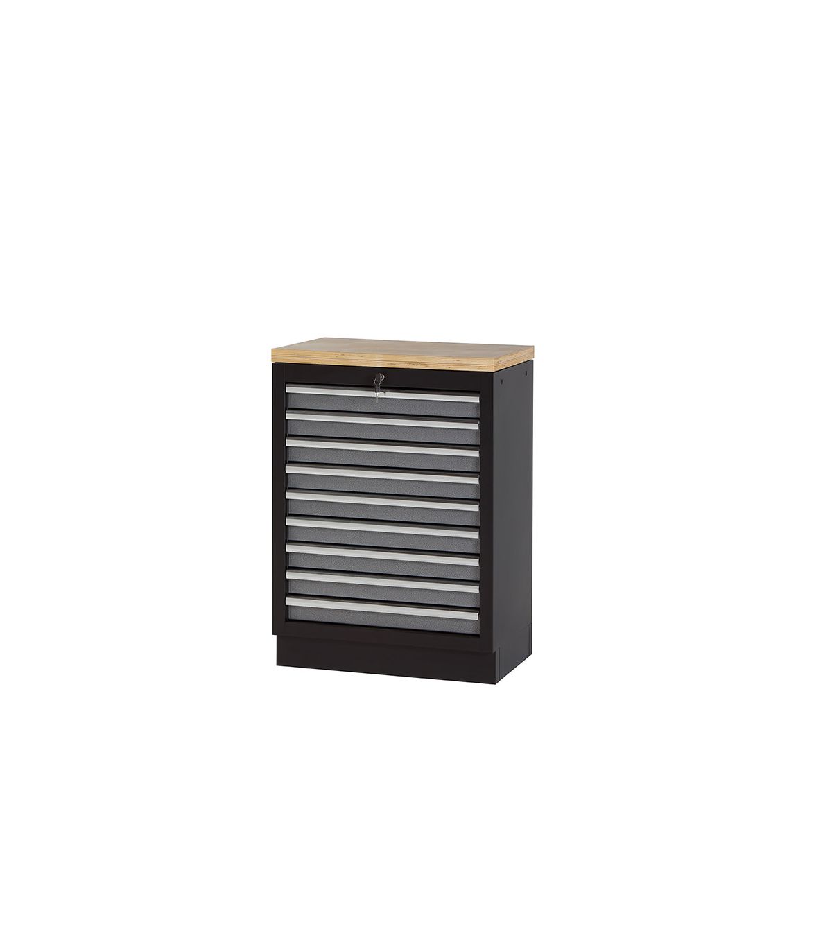 La supériorité technique de la référence 129870 réside dans son châssis en tôle d'acier de grade industriel. Malgré le nombre élevé de tiroirs et la charge potentiellement massive qu'ils peuvent contenir, la structure Alyco garantit une rigidité parfaite sans déviation angulaire. Les 9 tiroirs sont équipés de glissières télescopiques à roulements à billes de haute qualité, assurant une ouverture fluide et silencieuse. Le plan de travail en bois massif apporte une résilience naturelle et une durabilité exceptionnelle, capable de supporter les chocs et les compressions quotidiens tout en offrant une esthétique professionnelle soignée.