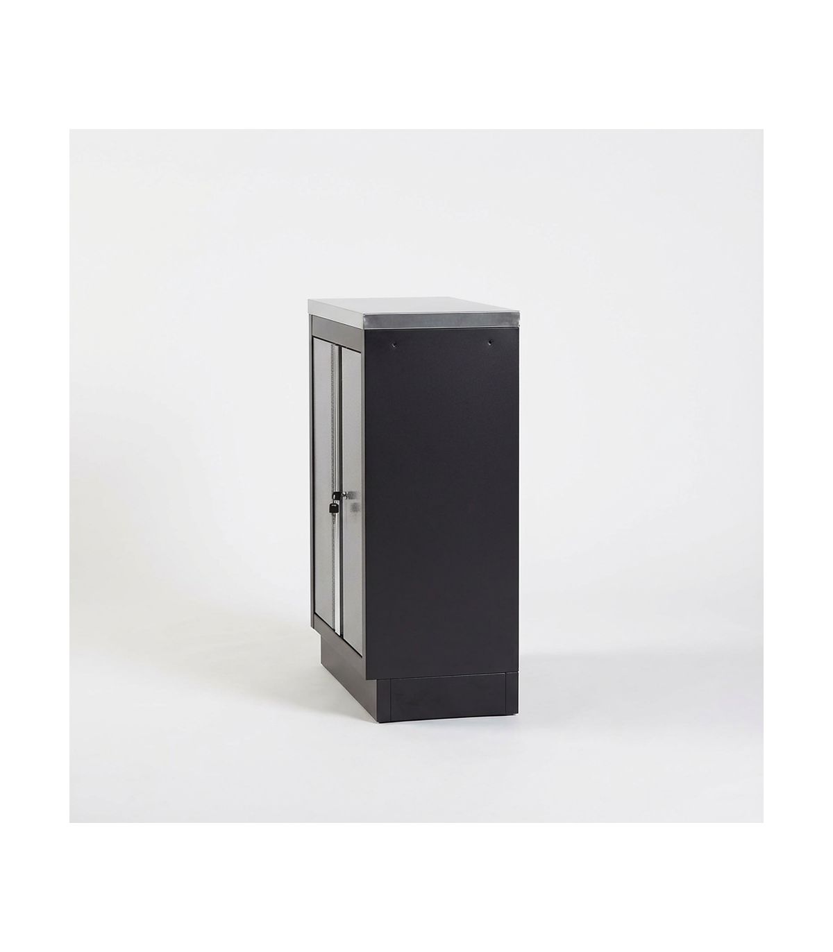 La supériorité technique de la référence 129876 repose sur l'utilisation d'acier inoxydable de haute qualité pour son plateau supérieur. Ce matériau ne craint ni l'humidité, ni la corrosion, ni les projections de produits chimiques agressifs, garantissant un aspect professionnel pour de nombreuses années. Sous ce plan de travail stratégique, l'armoire dispose d'un large compartiment fermé par deux portes robustes. L'étagère intérieure réglable permet d'ajuster le volume utile en fonction des équipements stockés, des bacs de quincaillerie aux machines portatives lourdes.